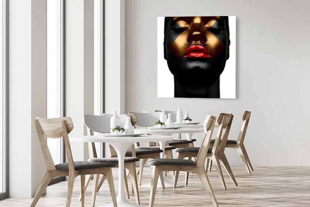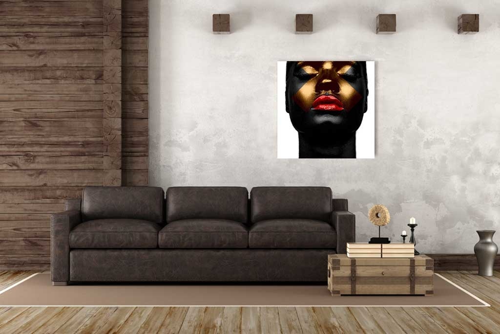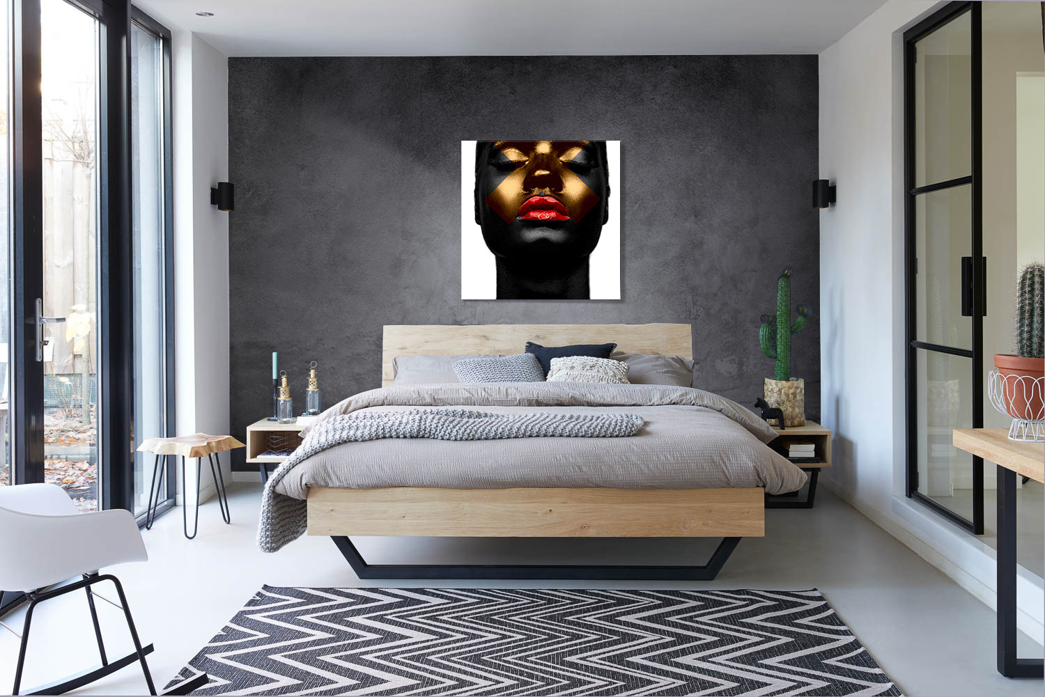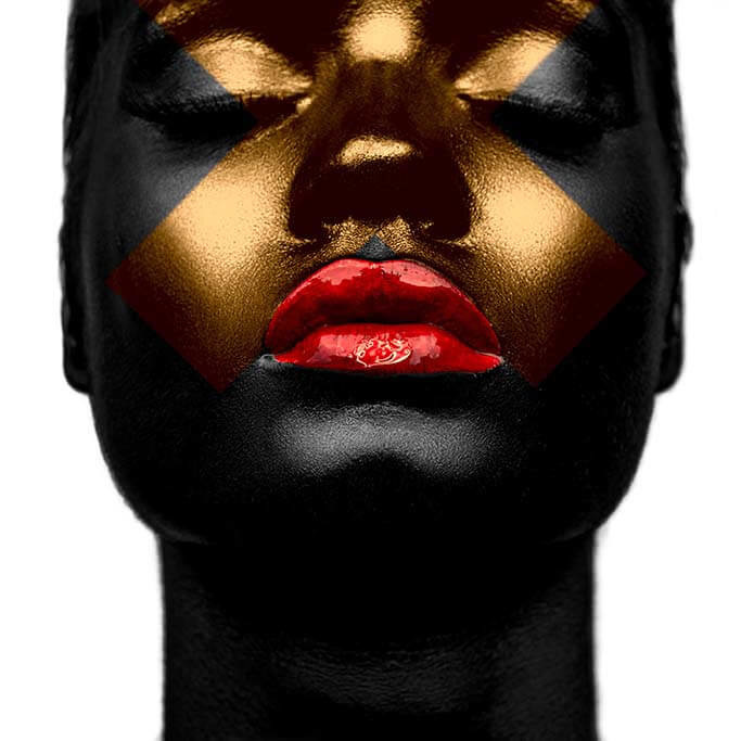 Gold mit schwarz lackiert schönes Gesicht mit roten Lippen und weißem Hintergrund, die Farbkombination macht dieses Bild ein besonderes Bild, das überall sein wird.