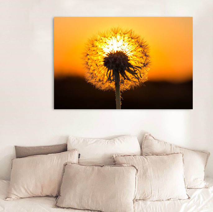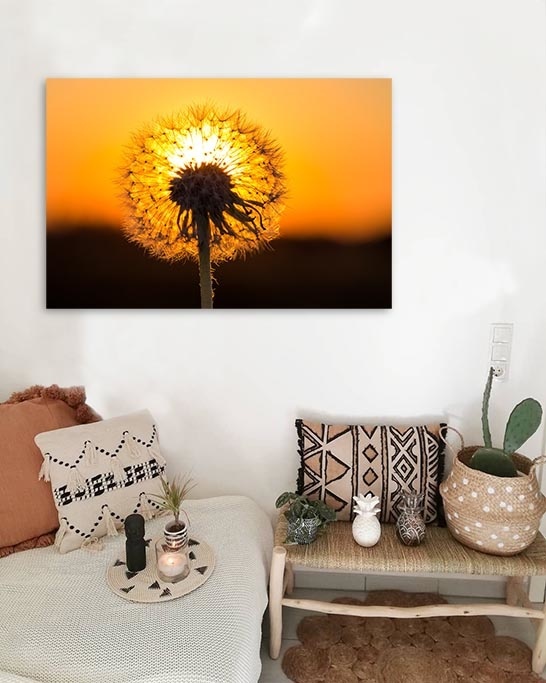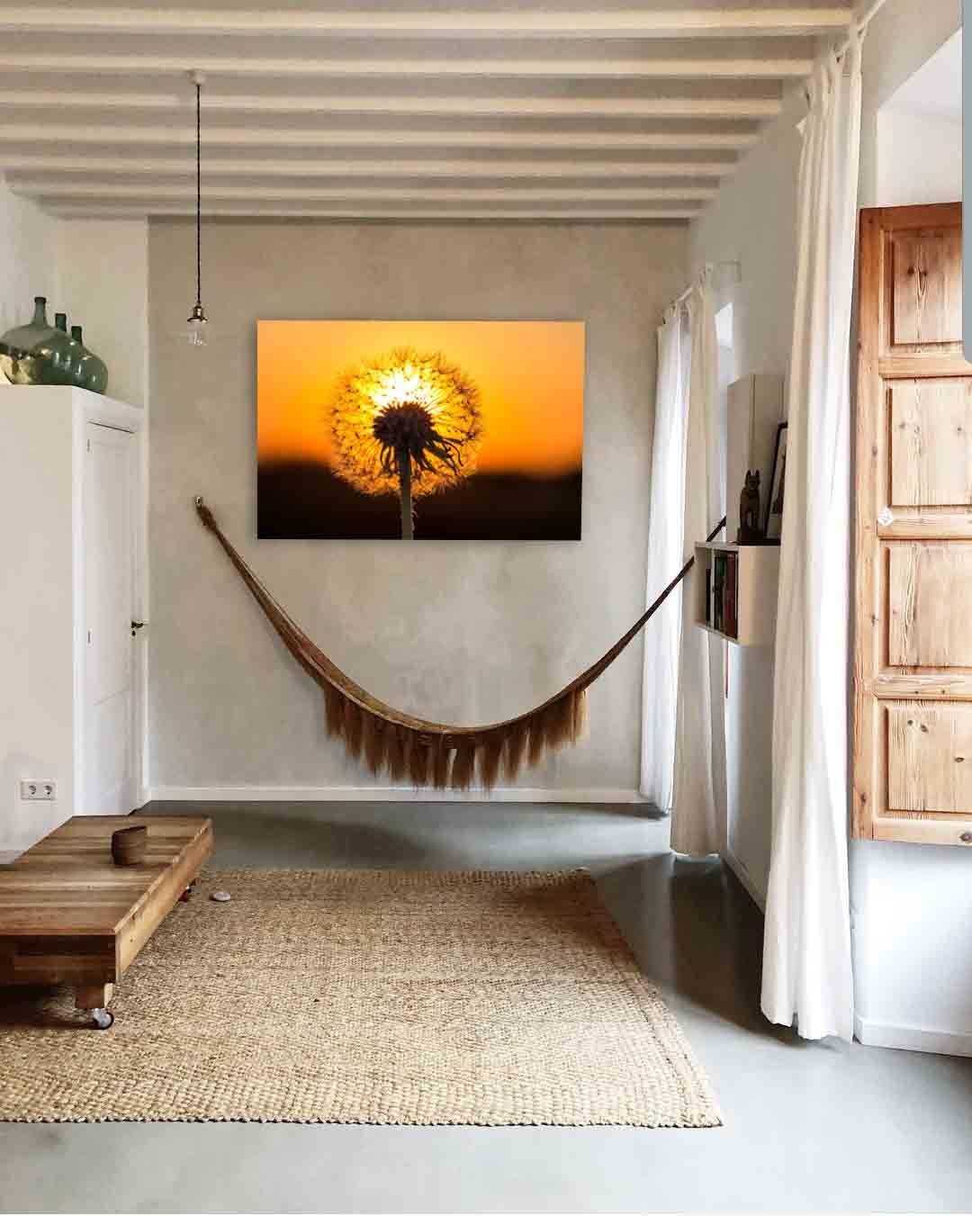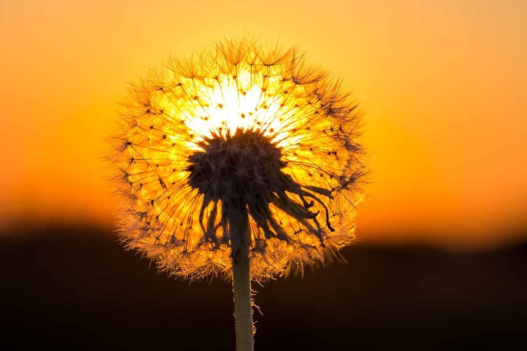 Nahaufnahme eines verblühten Löwenzahns, vor einem goldenen Horizont. Auffallend schöne Kunst.