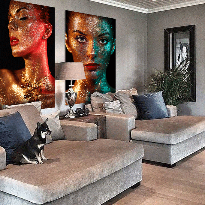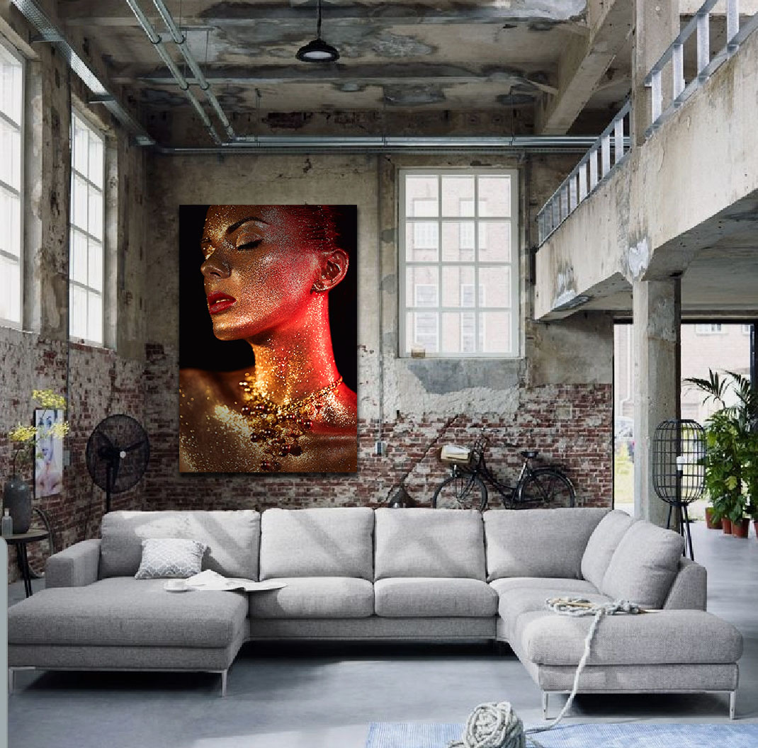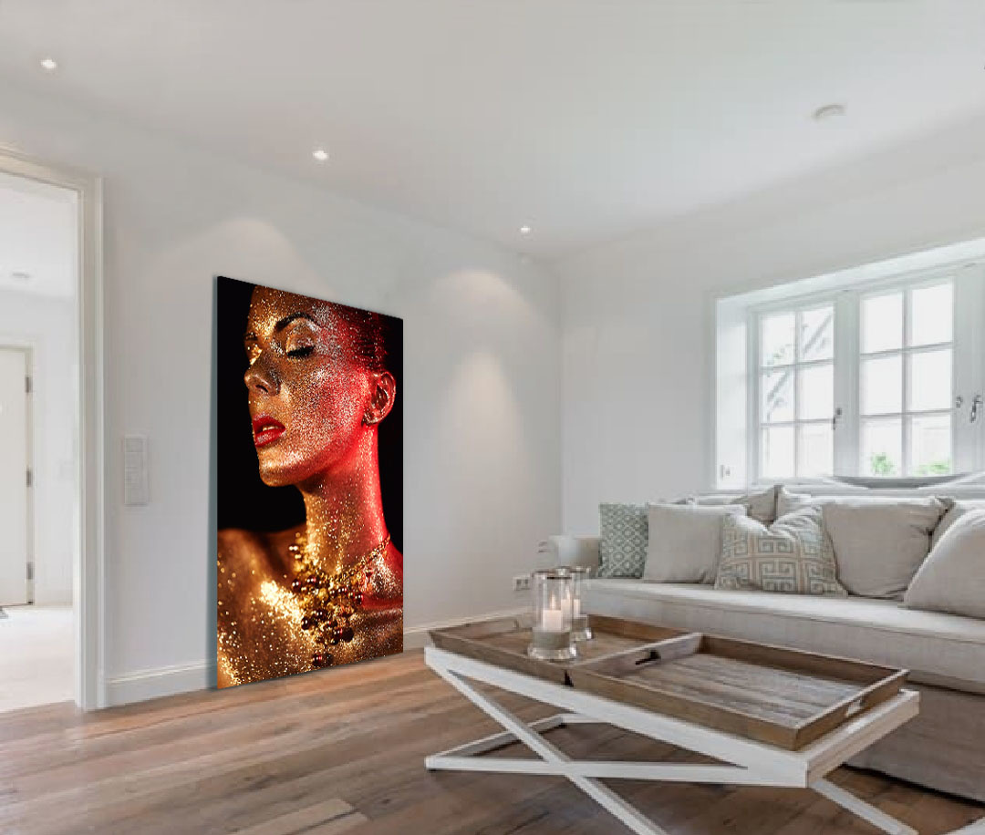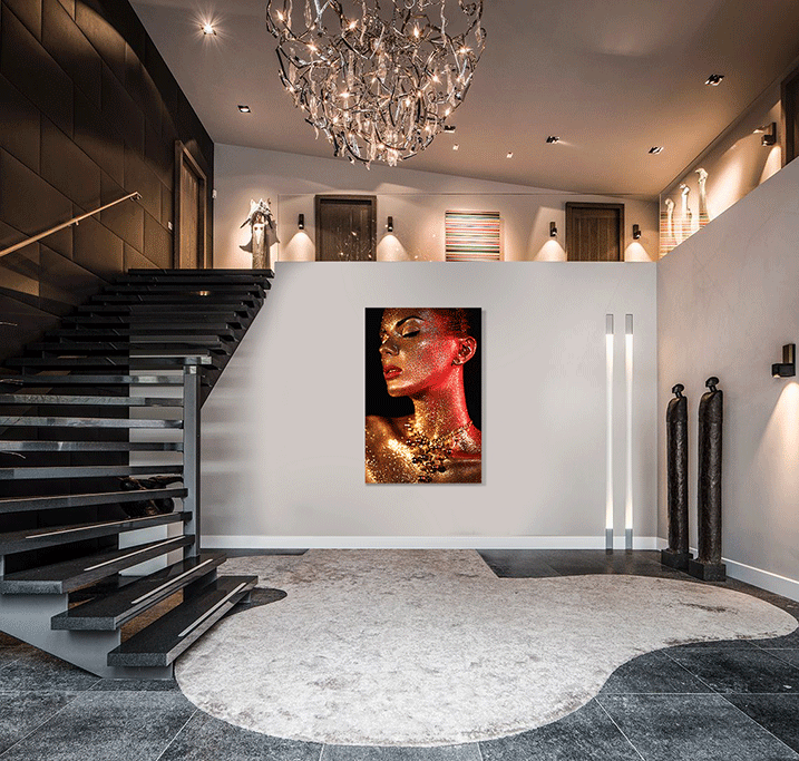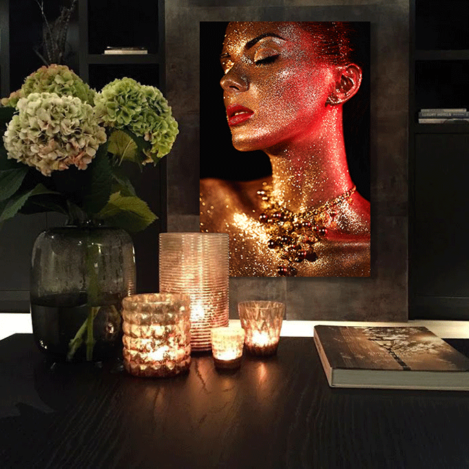 Eine Fotokunst mit dem Wow-Gefühl, das ist 'Gold ist das neue Schwarz'. Diese Kunst ist kontrastreich und trägt zu einem Gefühl von Luxus bei. Die Frau ist komplett in goldenes Glitzern getaucht. In Kombination mit dem Lichteinfall und dem dunklen Hintergrund springt diese Fotokunst regelrecht aus der Wand heraus. Das Artwork ist schick, hat aber auch etwas Sensationelles. In einem trendigen Interieur kommt diese Kunst besonders gut zur Geltung, aber natürlich ist sie in jedem Raum ein Blickfang!