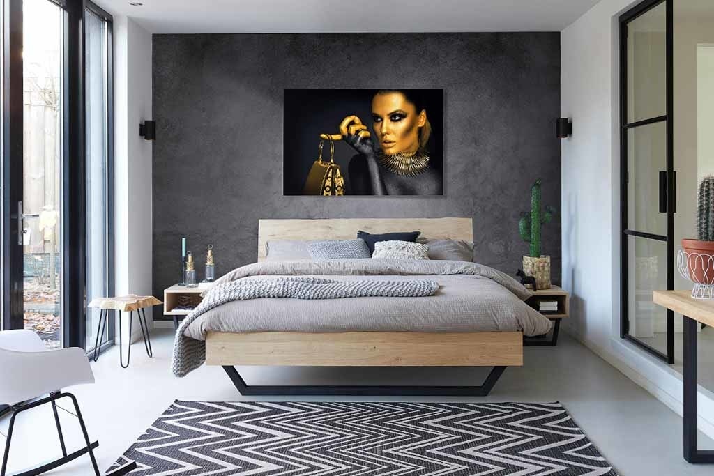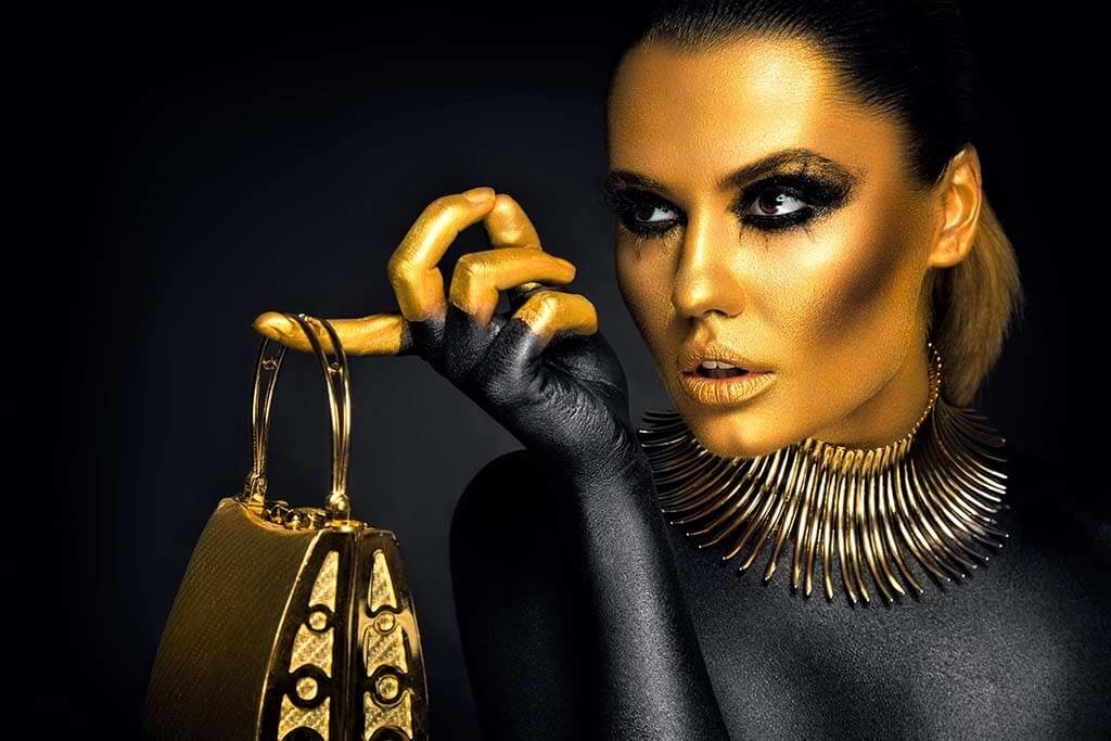 Spezielle Porträtfotografie einer in Gold gefärbten Frau. Der Kopf und die Finger der Frau sind golden, der Rest des Körpers ist schwarz gefärbt. An ihrem Finger hängt eine goldene Tasche. Kombinieren Sie mit den anderen Bildern dieser Serie und hängen Sie sie nebeneinander auf