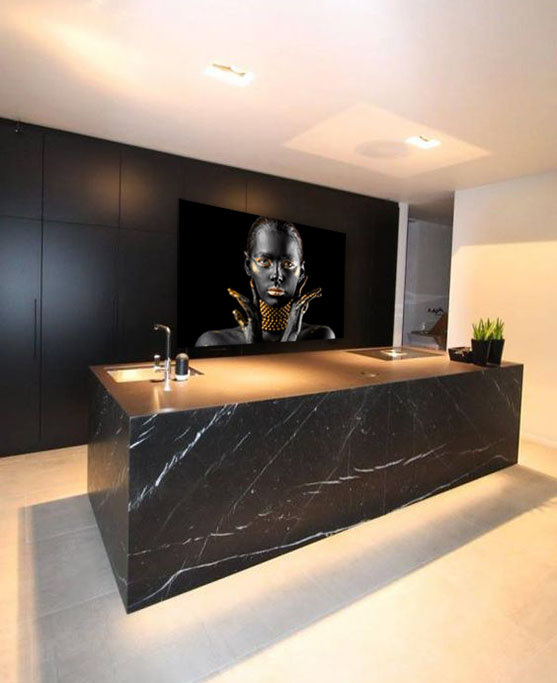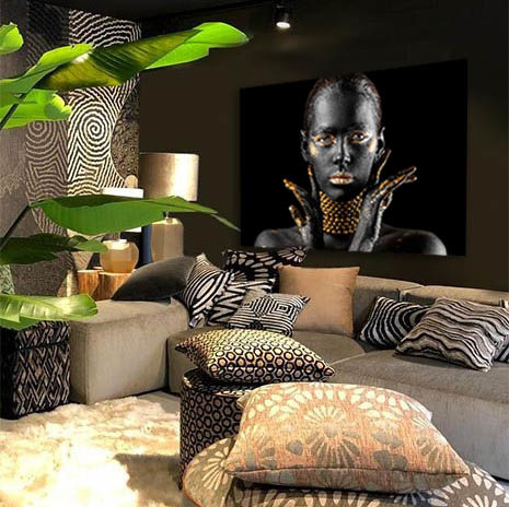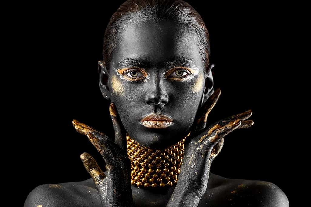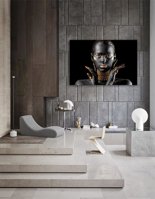 Eine fabelhafte Fotokunst einer Frau, gemalt in stilvollen Schwarz- und Goldtönen. Ihr Körper ist ein Kunstwerk für sich und verblüfft einen immer wieder aufs Neue. Diese symmetrische Fotokunst ist reich an Kontrasten für das ultimative Gefühl von Luxus. Zusätzlich verleiht die Goldkette dem Bild ein noch reicheres Aussehen. Eine schöne Ergänzung für eine trendige Einrichtung, in der goldene Details verwendet werden und in der Stil immer an erster Stelle steht.