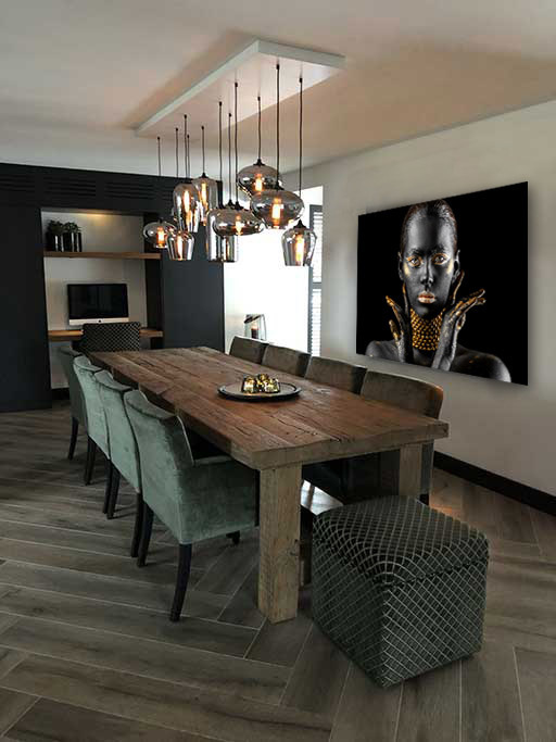 Die Fototafel hat rundum ein luxuriöses Aluminiumprofil auf der Rückseite und kann mit einem Schraubendaumen (Haken) an die Wand gehängt werden. Das hintere Profil sorgt für Stabilität und verhindert ein Verziehen der Verkleidung. Da das Profil 2 Zentimeter dick ist, wird ein schwebender Effekt Ihres Kunstwerks an der Wand erzeugt.