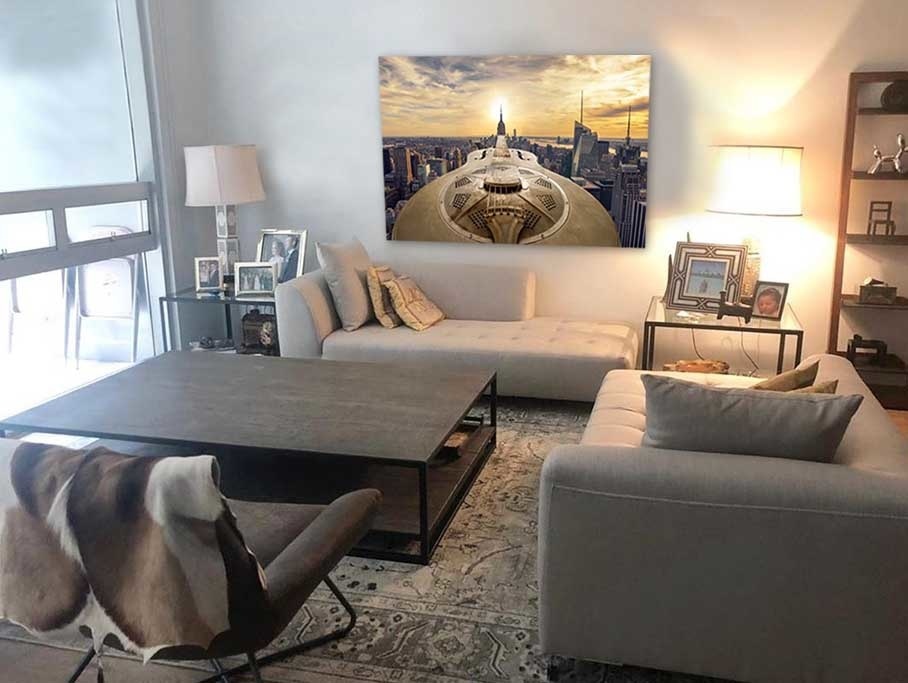 Die Fototafel hat rundum ein luxuriöses Aluminiumprofil auf der Rückseite und kann mit einem Schraubendaumen (Haken) an die Wand gehängt werden. Das hintere Profil sorgt für Stabilität und verhindert ein Verziehen der Verkleidung. Da das Profil 2 Zentimeter dick ist, wird ein schwebender Effekt Ihres Kunstwerks an der Wand erzeugt.