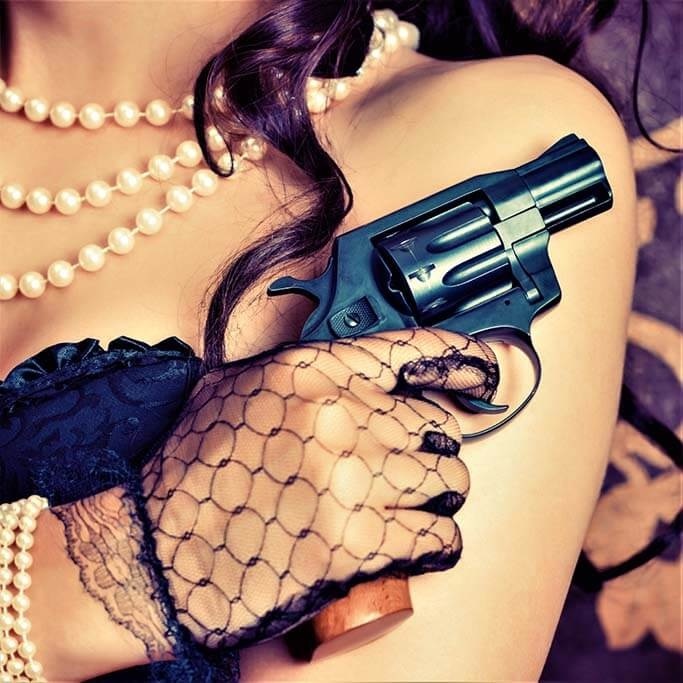 Gewagte, aufregende Kunst, von einer schick gekleideten Frau mit einer Pistole in der Hand, die auf den Täter wartet, ebenfalls in schwarz-weiß.