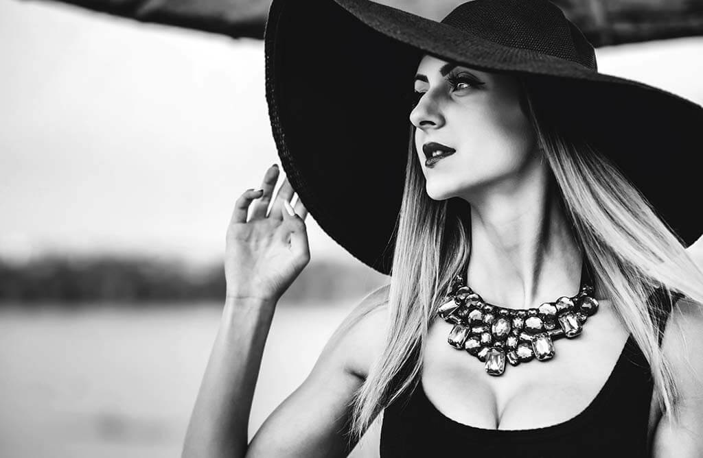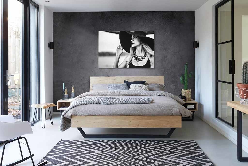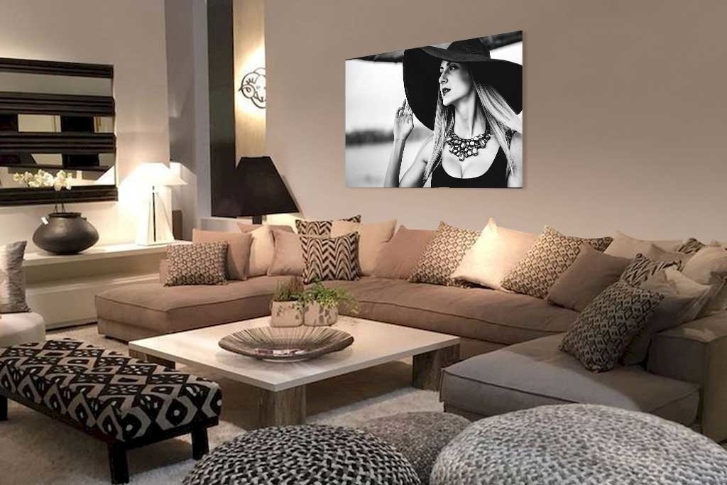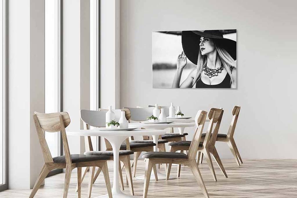 Ein Schwarz-Weiß-Bild einer Frau mit einem Hut. Die junge Frau trägt einen großen schwarzen Hut und schaut verträumt in die andere Richtung. Dieses Schwarz-Weiß-Porträtfoto passt zu fast jedem Stil und sieht in allen Räumen des Hauses gut aus. Kann auch mit anderen Bildern kombiniert werden.