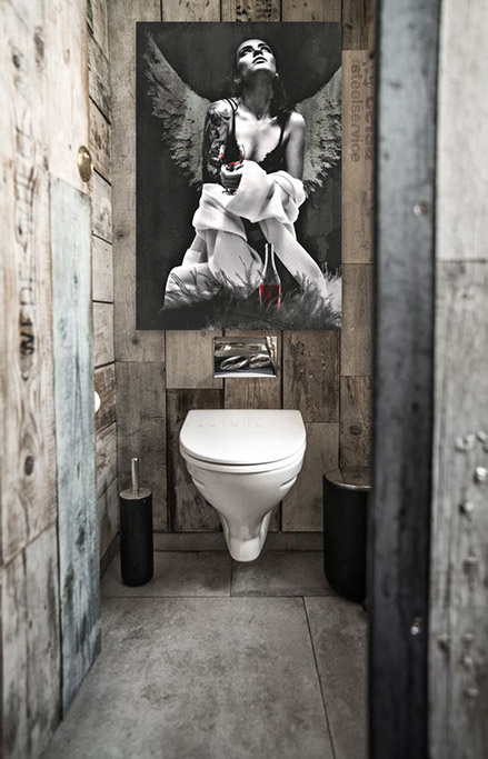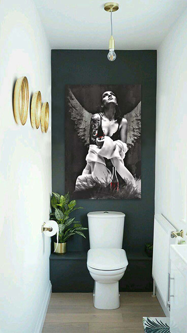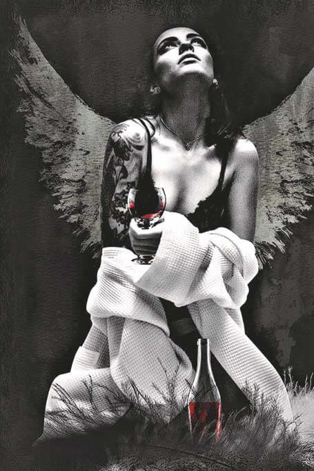 Der Himmel ist ein Ort auf der Erde, ungewöhnliche Kunstfotografie einer Frau mit Flügeln in Morgenmantel, halb angezogen, so dass BH und Tattoos sichtbar sind, die mit einem Glas Rotwein nach oben schaut.