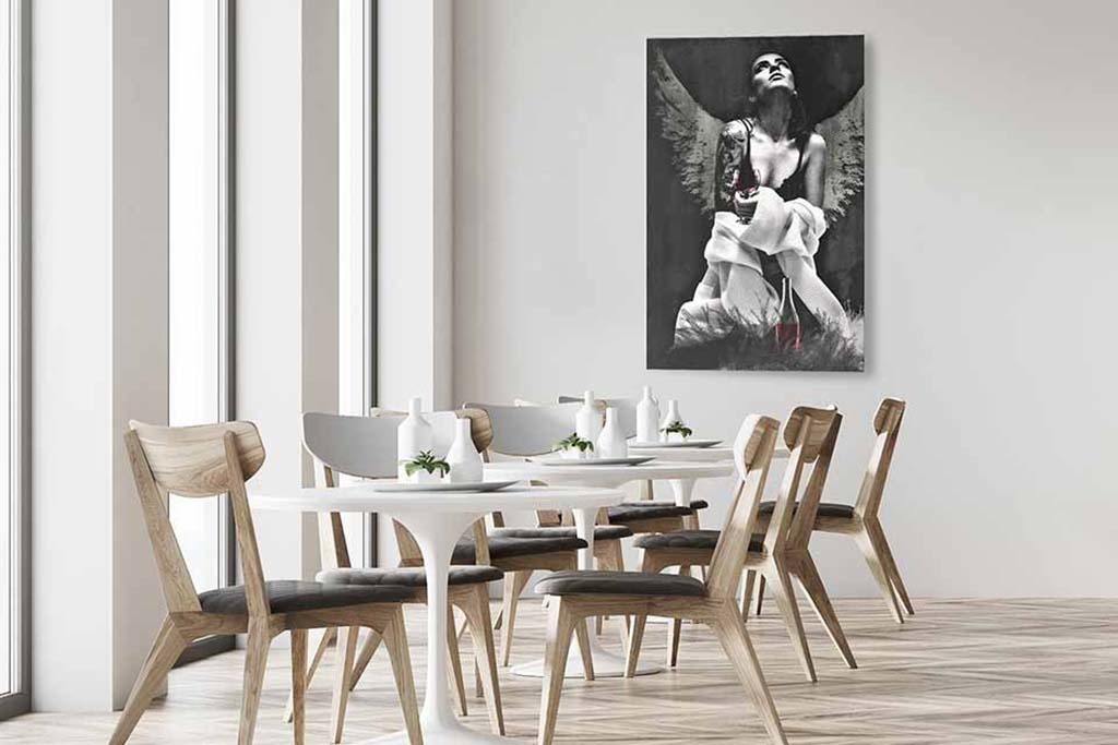 Die Fototafel hat rundum ein luxuriöses Aluminiumprofil auf der Rückseite und kann mit einem Schraubendaumen (Haken) an die Wand gehängt werden. Das hintere Profil sorgt für Stabilität und verhindert ein Verziehen der Verkleidung. Da das Profil 2 Zentimeter dick ist, wird ein schwebender Effekt Ihres Kunstwerks an der Wand erzeugt.