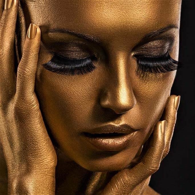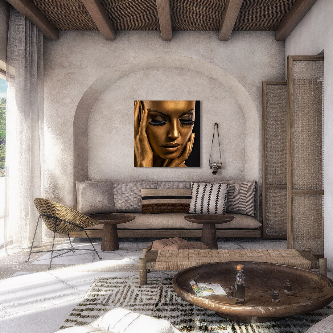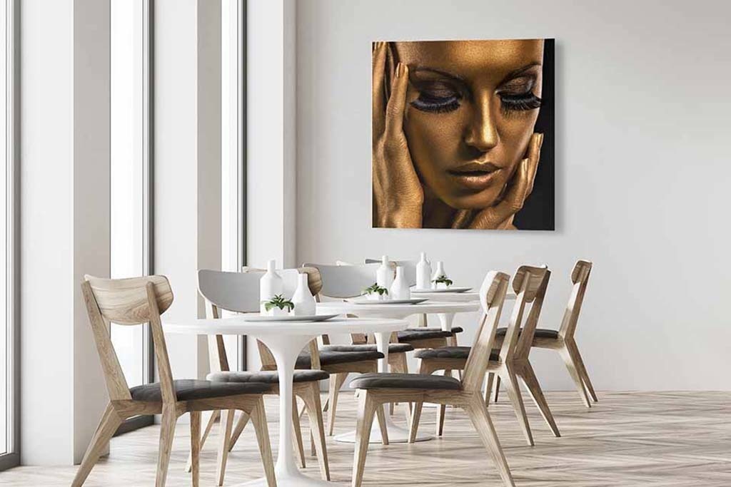 Bild einer Frau, deren Gesicht mit Goldfarbe bedeckt ist. Die Hände der Frau sind ebenfalls goldfarben. Schön zu kombinieren mit den anderen Bildern dieser Serie. Sieht gut aus im Wohnzimmer, Schlafzimmer, Flur und Büro. Passt zu verschiedenen Wohnstilen.