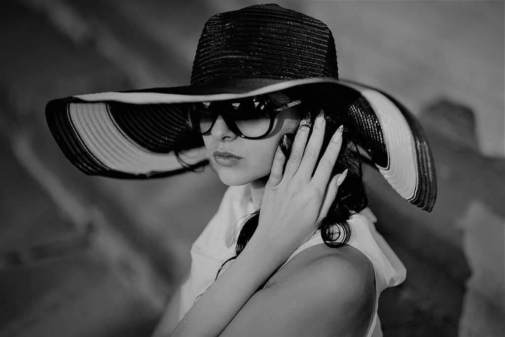 Hochwertige, schöne Frau mit Hut und großer Vintage-Sonnenbrille, erinnert an die Zeit von Audrey Hepburn