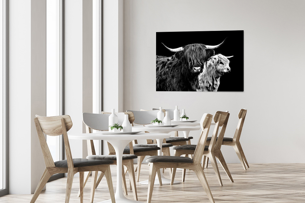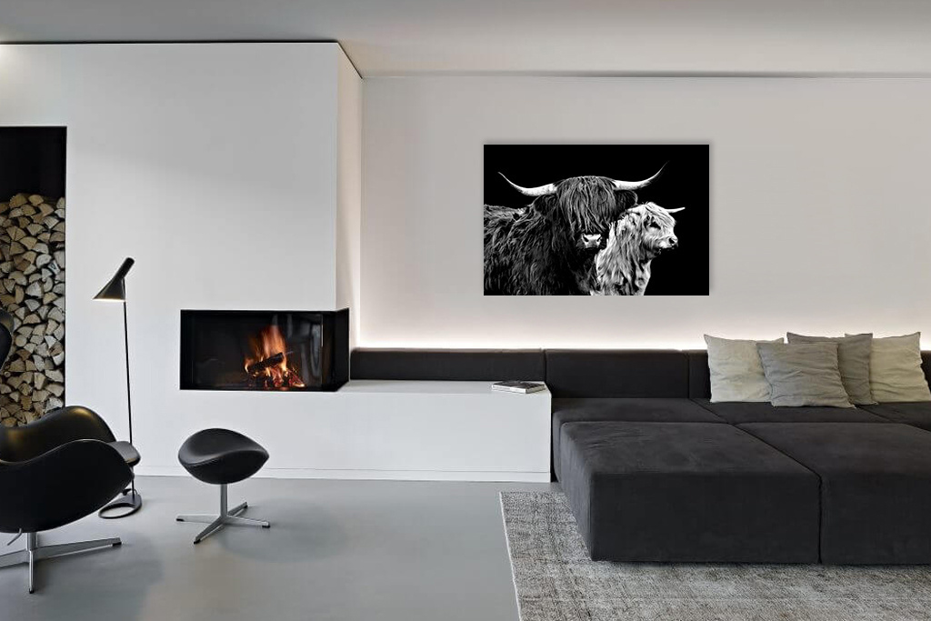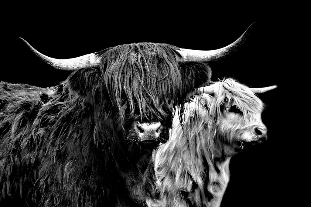 Zwei Highlander, schönes Schwarz-Weiß-Bild dieser prächtigen Tiere.