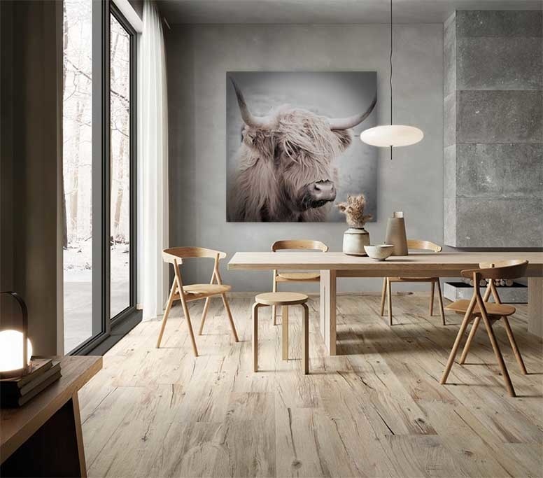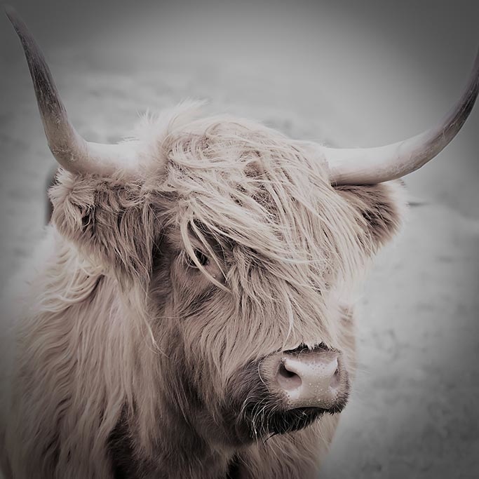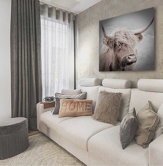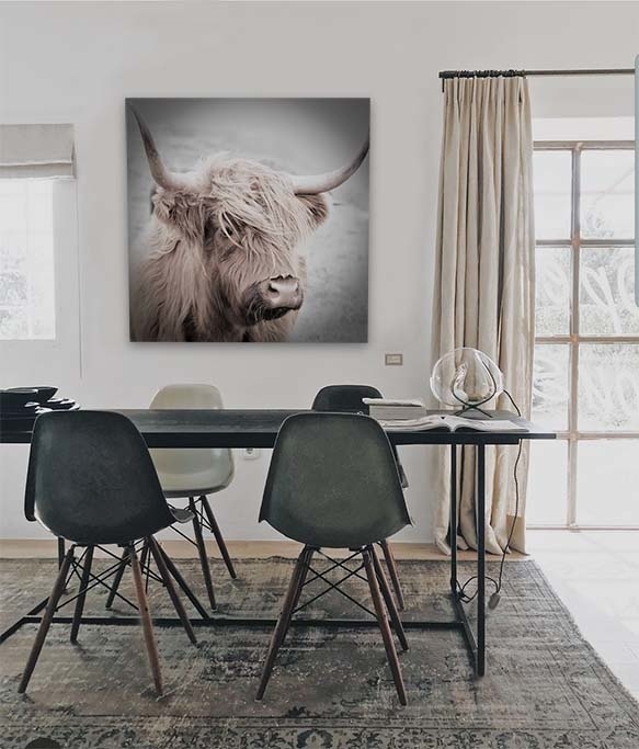 Die schottische Hochlandkuh ist eine in Schottland beheimatete Rinderrasse. Diese schönen fotogenen Tiere haben lange Haare und lange Hörner. Hier in einer schönen künstlerischen Art und Weise abgebildet, eine auffallende Kunst, die gut in ein modernes Interieur passt.