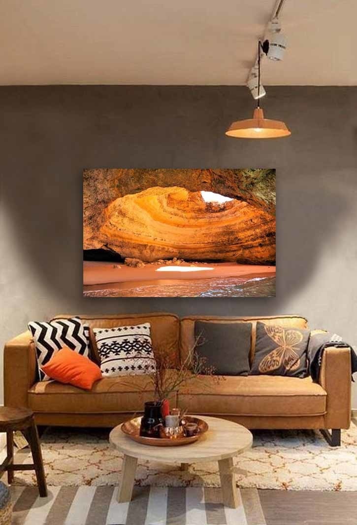 Prächtige Kunst mit schönem Licht aus der Benagil-Höhle in Portugal. Die gelb-orangenen Tone lassen Ihre Wand sprechen.