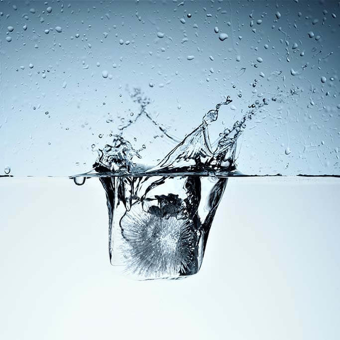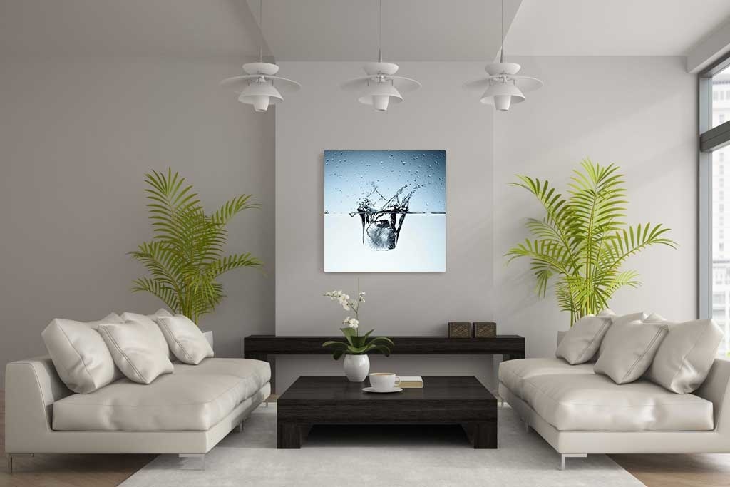 Abstrakte Fotokunst eines in Wasser fallenden Eiswürfels, sehr schön zu kombinieren mit einem ähnlichen Bild bei Xi art for sale.