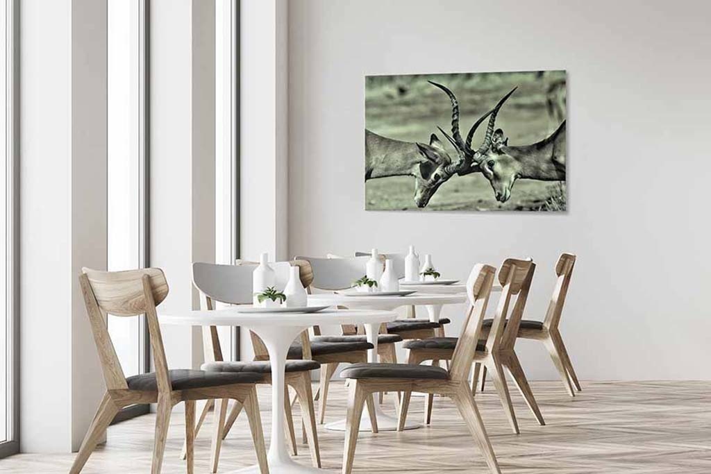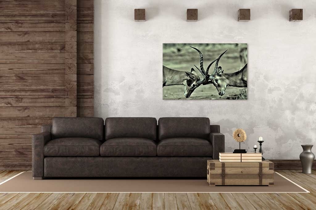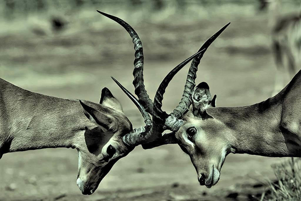 Künstlerisches Bild von zwei kämpfenden Böcken mit ihren Geweihen ineinander.