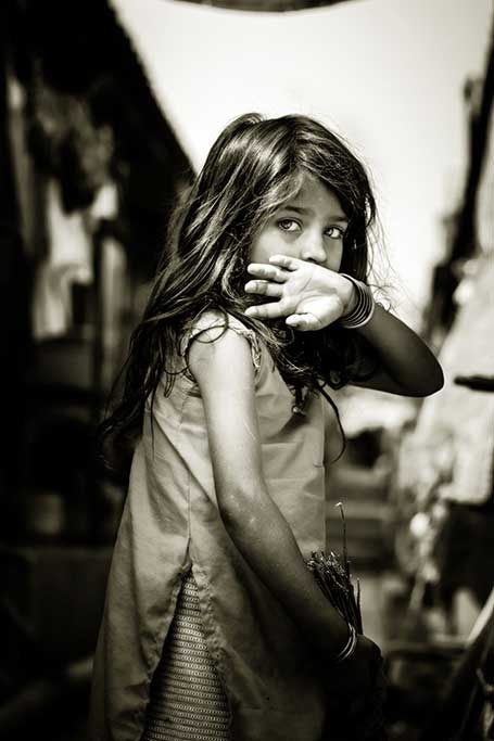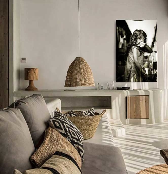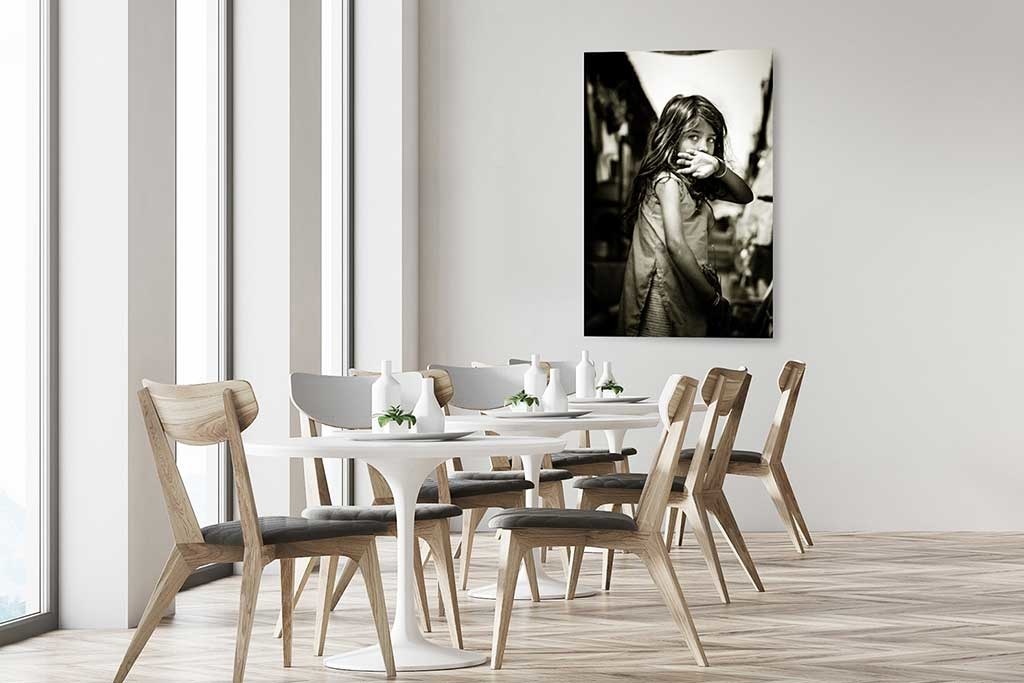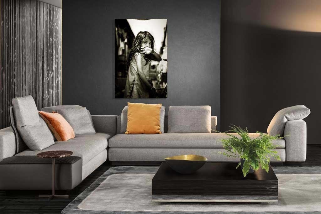 Bild eines jungen indischen Mädchens. Das Kind schaut direkt in die Kamera und hält sich eine Hand vor den Mund. Der Sepia-Farbeffekt macht das Bild noch interessanter zu betrachten. Kann mit anderen Porträtbildern mit diesem Farbton kombiniert werden. Passt zu vielen verschiedenen Wohnstilen.