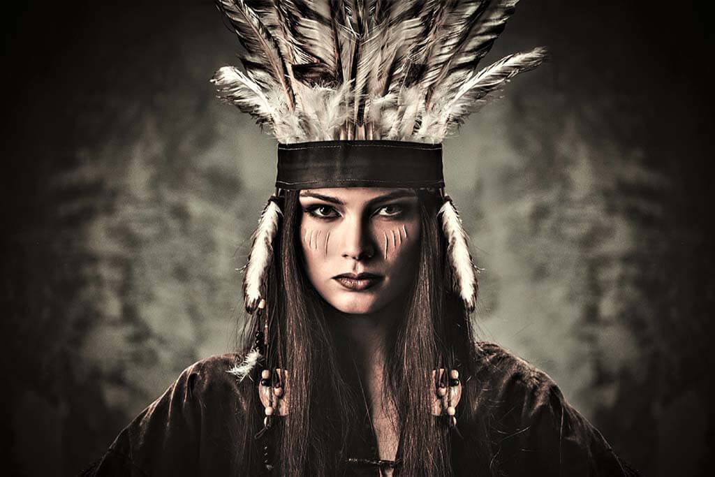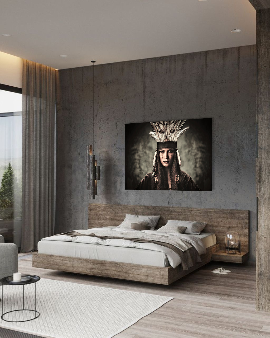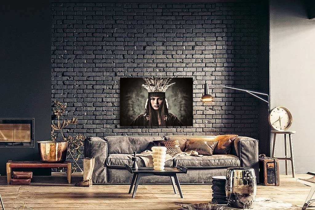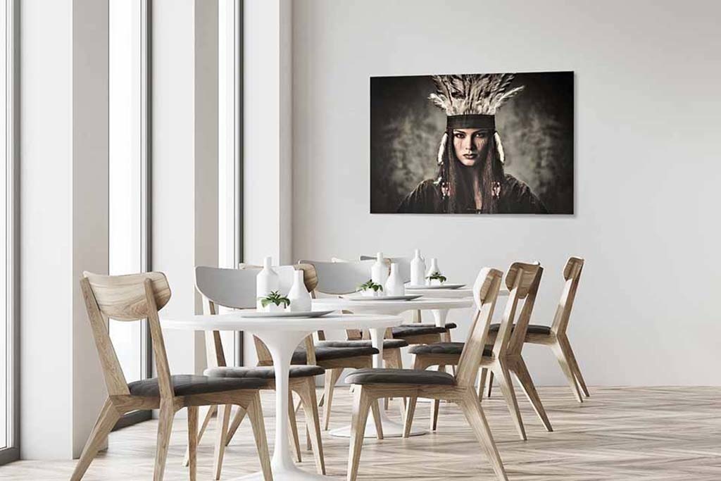 Frau mit indianischem Kopfschmuck. Schöne Farbtöne. Durch den kraftvollen Blick in ihren Augen hat das Foto auch etwas Cooles. Kombinieren Sie mit anderen Porträtfotos und erstellen Sie Ihre eigene Serie. Passt in fast jeden Innenraum.