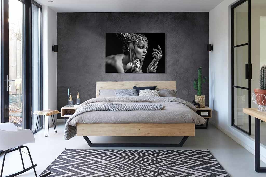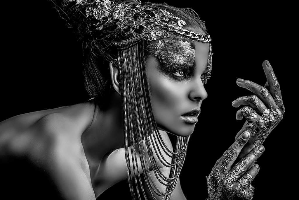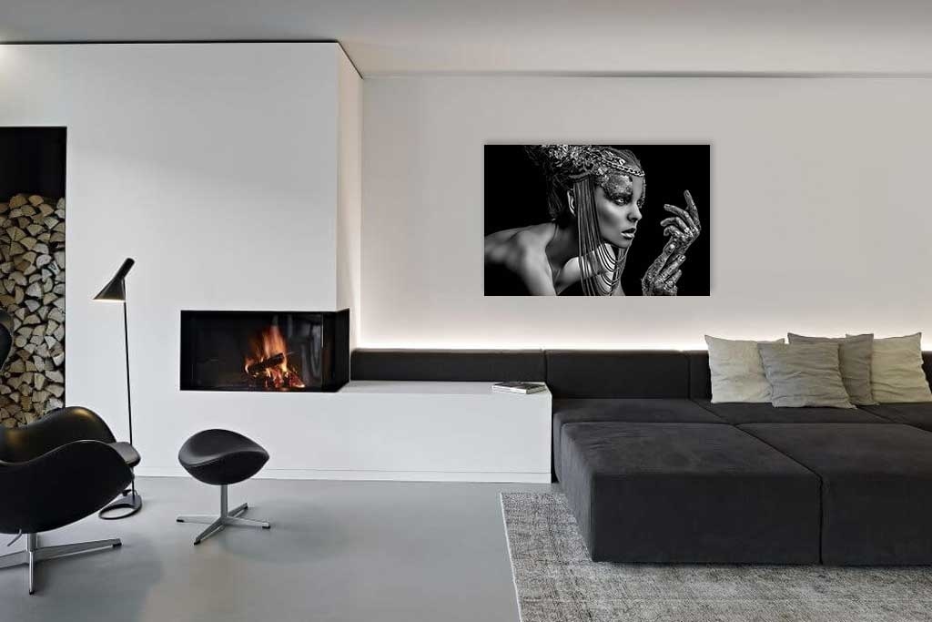 Besonderes Schwarz-Weiß-Porträt einer Frau. Die Frau hat etwas Königliches, was wahrscheinlich an ihrem Kopfschmuck und Make-up liegt. Die Tatsache, dass sie nichts anderes trägt, macht das Bild noch interessanter. Befindet sich deutlich über dem Bett im Schlafzimmer. Schön zu kombinieren mit anderen Porträts.