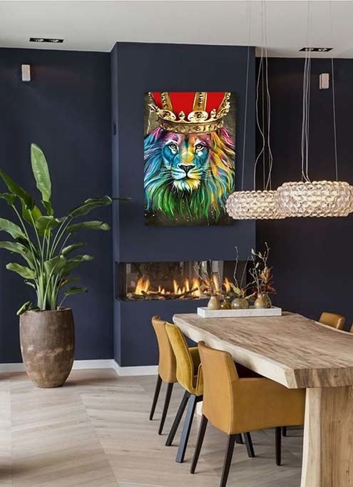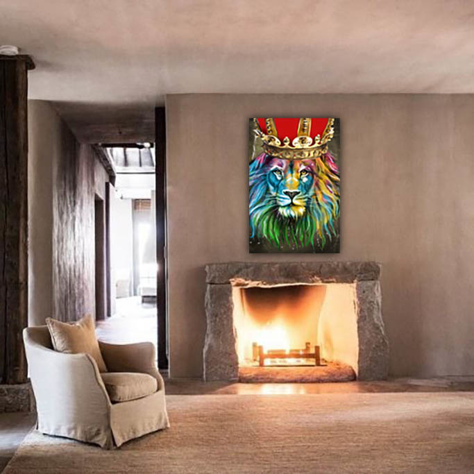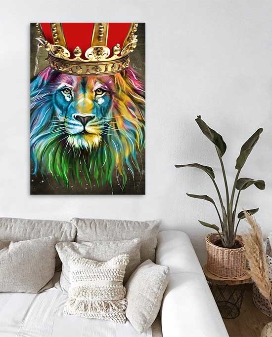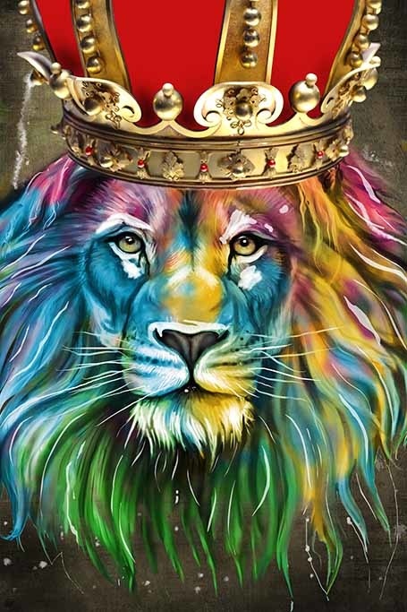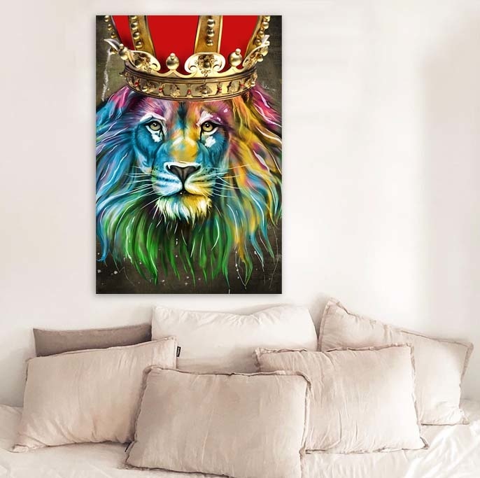 Modern, schön phantasievoll und sehr buntes Bild eines Löwen mit Krone. Der König der Löwen. Sieht schön aus in einer modernen Einrichtung und natürlich sehr schön in einem Kinderzimmer. Mit Echtheitszertifikat.