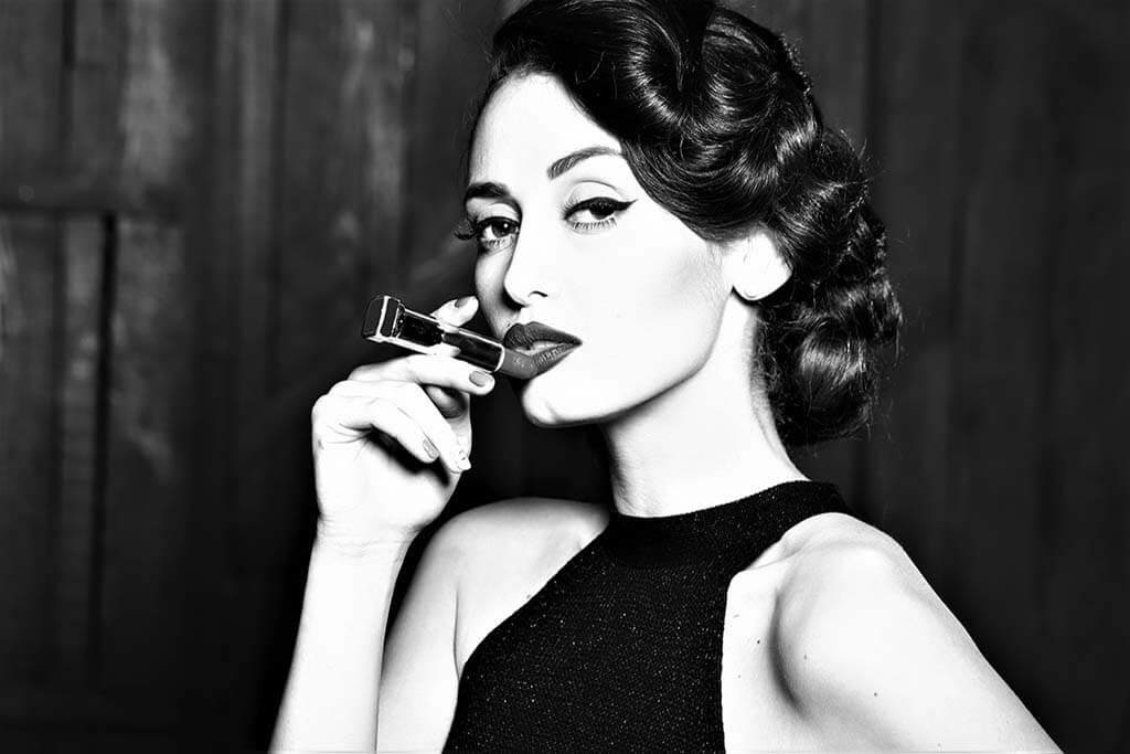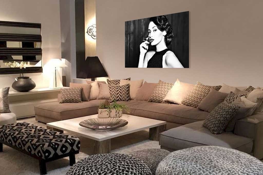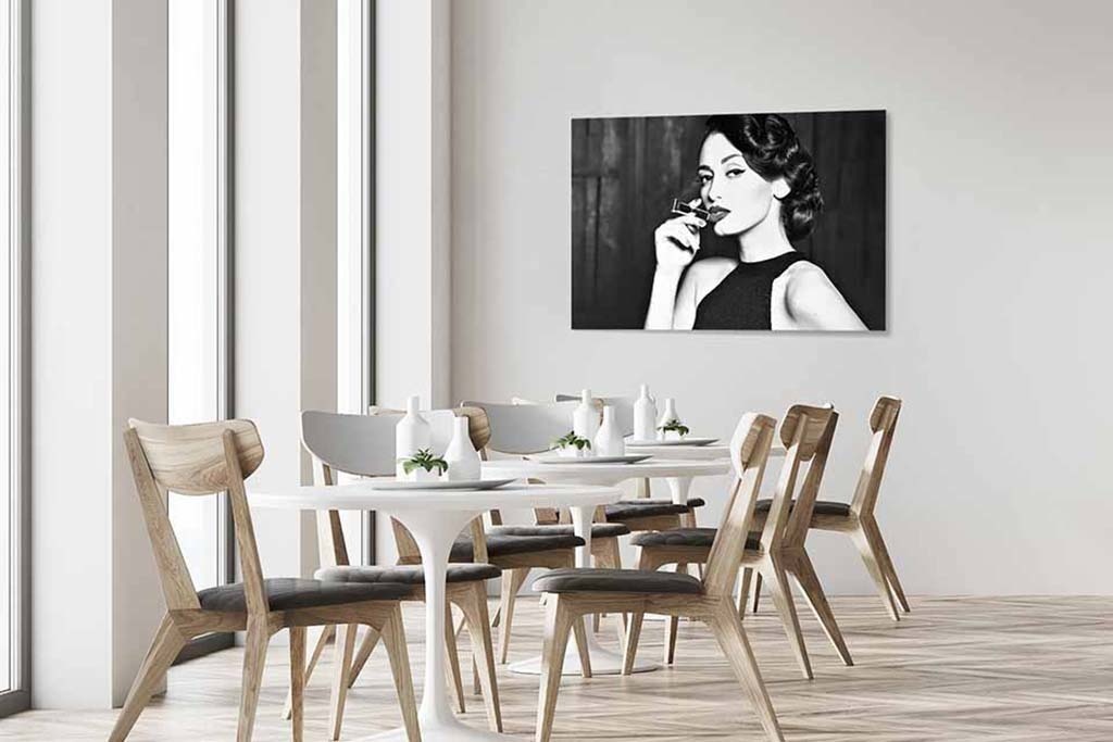 Stilvolle Schwarz-Weiß-Porträt einer Frau mit Lippenstift. Die Frau trägt gerade den Lippenstift auf und schaut direkt in die Kamera. Man könnte fast meinen, sie hätte eine Zigarette in der Hand. Ein schönes und interessantes Bild für an der Wand so. Passt zu vielen Wohnstilen.