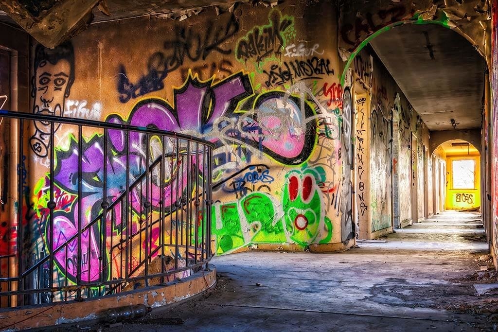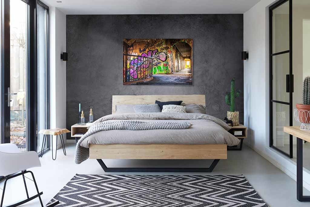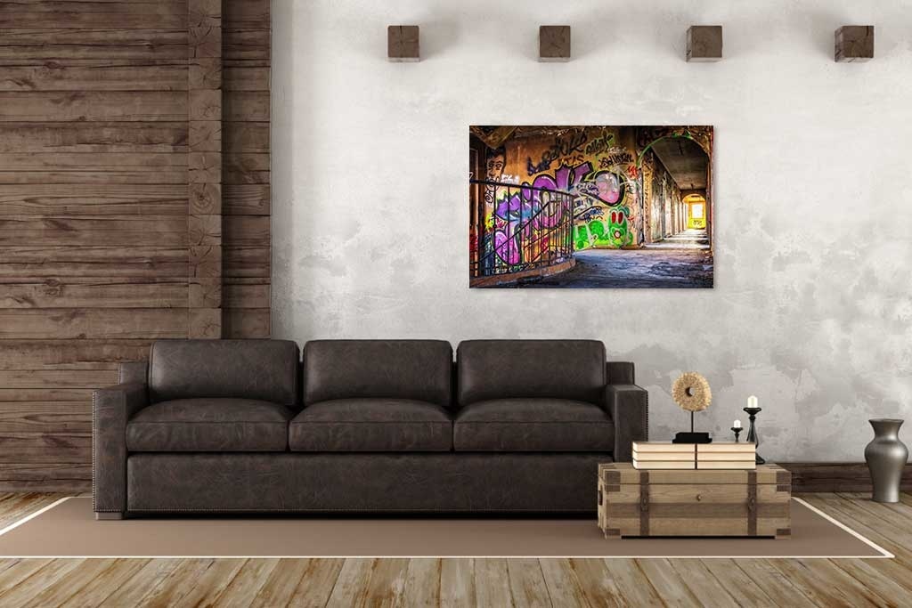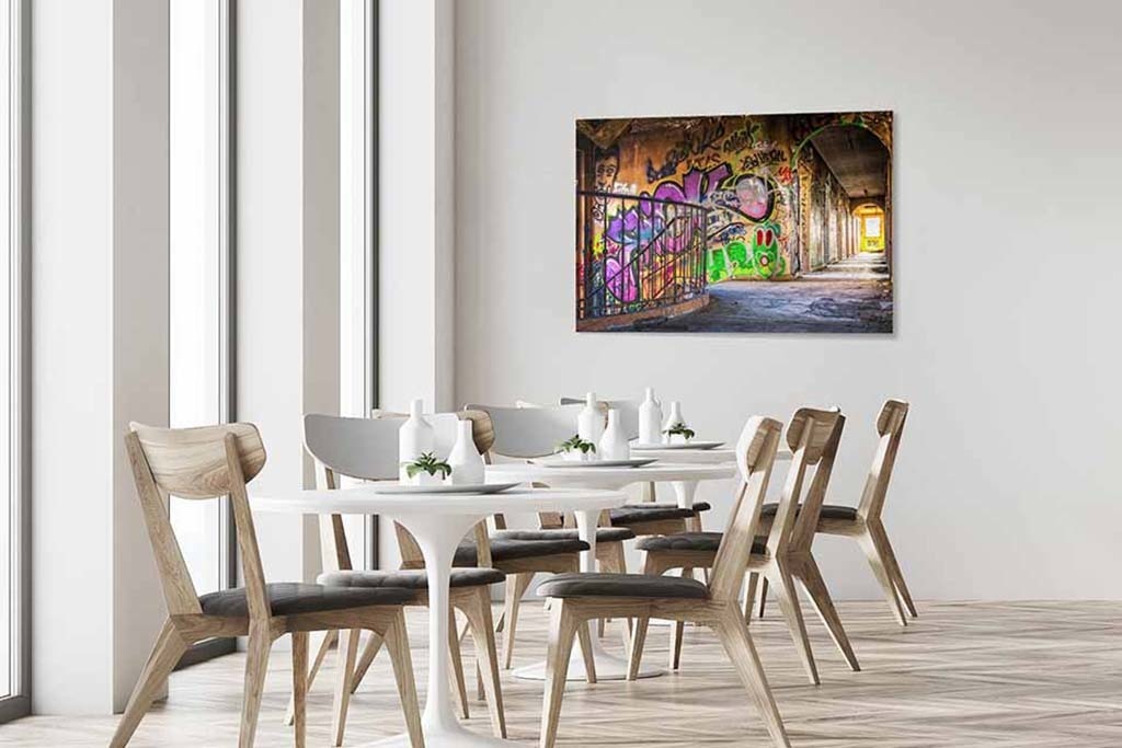 Bunte Darstellung einer verlassenen Straße, deren Mauern auf kunstvolle Art mit Graffiti verziert wurden. Schön, wenn man ein paar ähnliche Bilder in Gruppen an der Wand kombiniert.
