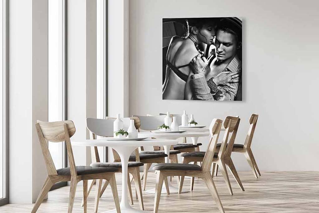 Schwarz-Weiß-Foto eines Paares in einem Auto. Das Paar befindet sich mitten in einem intimen Moment und das macht das Bild sehr kraftvoll. Kombinieren Sie dieses Bild mit anderen Schwarz-Weiß-Porträtfotos und erstellen Sie Ihre eigene Serie. Sieht in jedem Raum des Hauses gut aus.