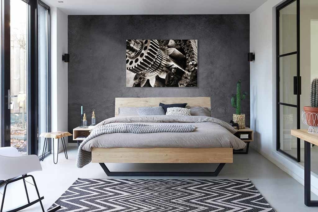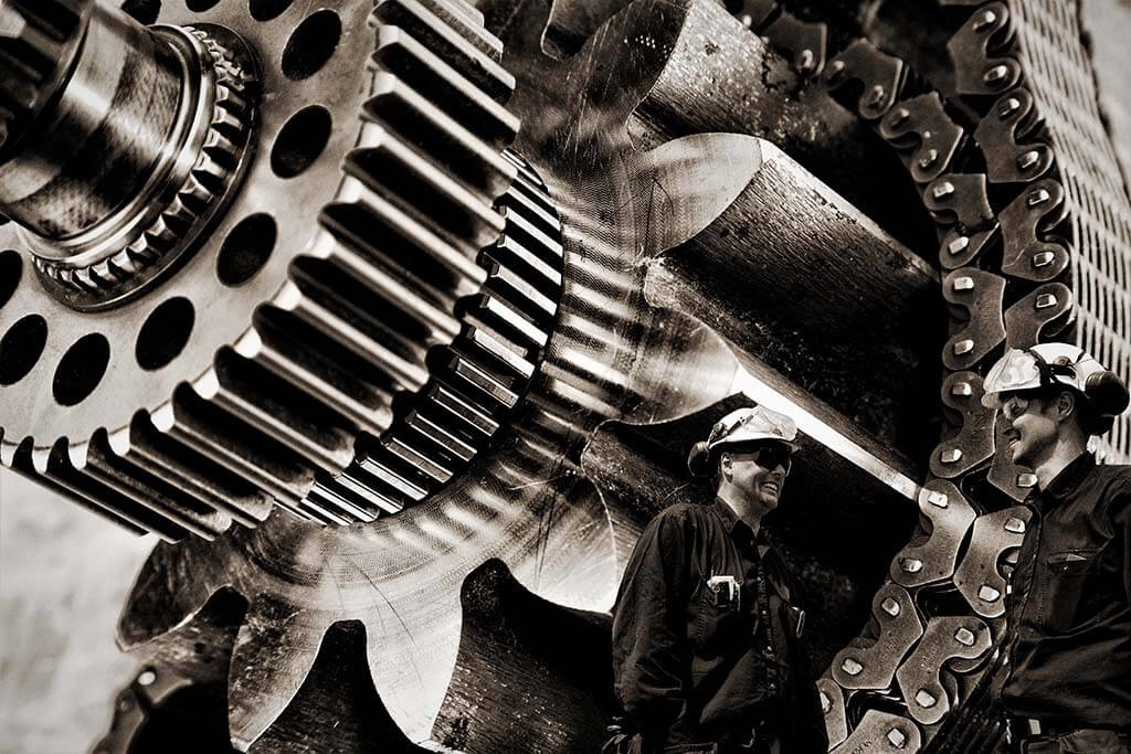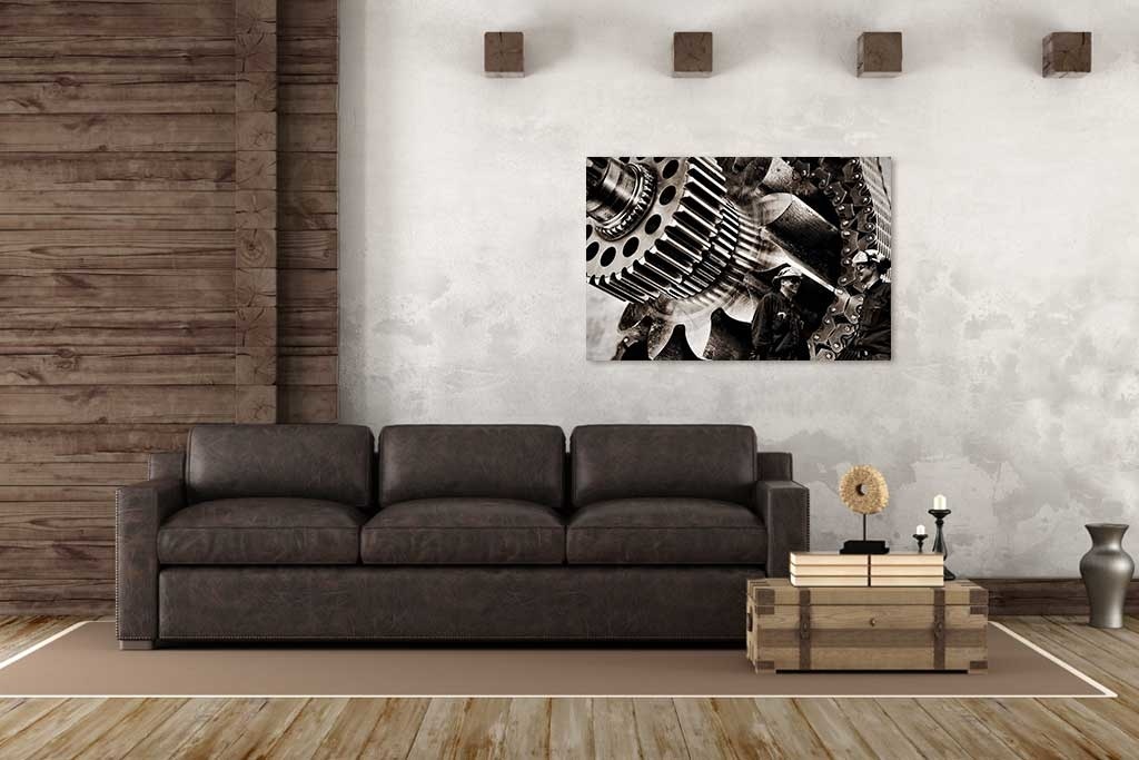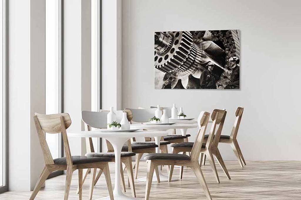 Für alle, die ein Stück harte Maschinerie lieben. Markant im Bild sind die vergrößerten Maschinenteile mit zwei Arbeitern im Vordergrund. Der Schwarz-Weiß-Effekt verleiht den robusten Komponenten zusätzlichen Charakter. Hängen Sie das besondere Schwarz-Weiß-Foto z.B. in Ihrem Wohn- oder Arbeitsbereich auf.