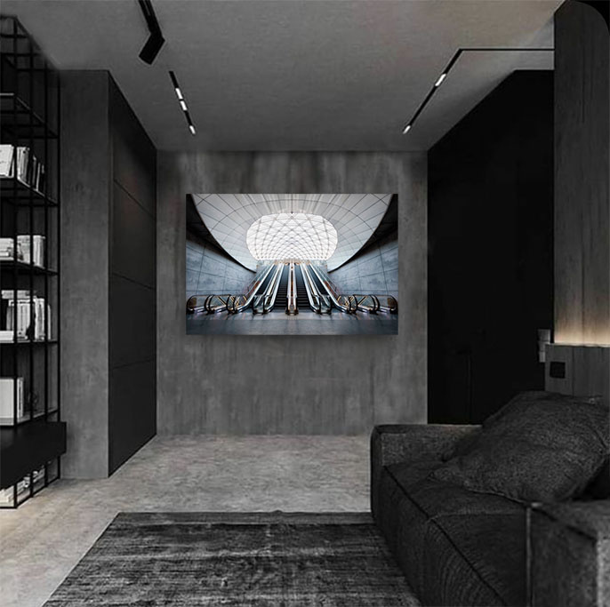 Diese Fotokunst zeigt ein schönes, futuristisches Bild der U-Bahn in der Stadt Malmö in Schweden. Die Stadt ist eine wichtige Straßen- und Bahnverbindung zwischen Schweden und Dänemark. Außerdem ist Malmö eine sehr moderne Stadt, was sich auch im architektonischen Stil der Metrostation widerspiegelt. Der schöne Lichteinfall macht das Gebäude noch beeindruckender. Die ideale Wahl für eine moderne Einrichtung oder um Ihrer aktuellen Einrichtung einen modernen Touch zu geben.