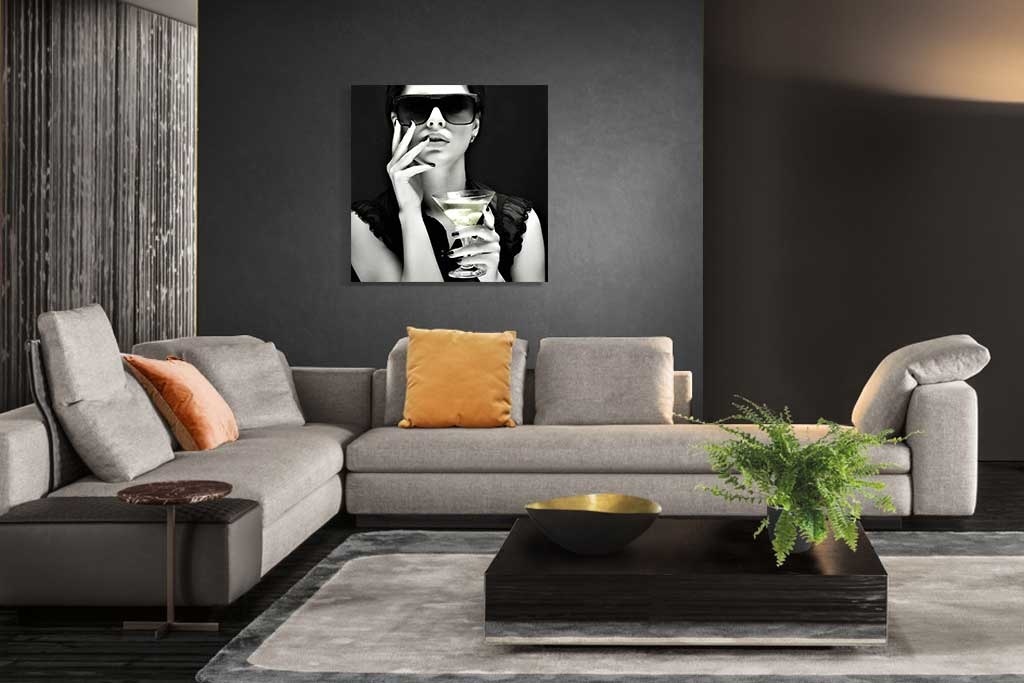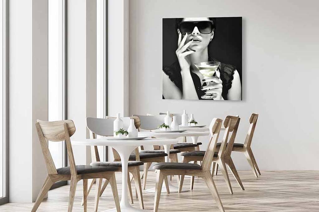 Vintage-Bild einer schönen Frau mit großer Sonnenbrille und einem Glas in der Hand. Dieses Schwarz-Weiß-Bild passt zu fast jedem Interieur und hat einen weinroten Look.