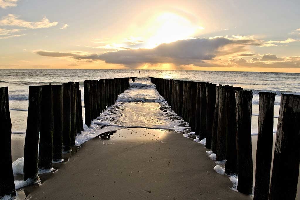 Schönes Bild eines Holzstegs bei Sonnenuntergang.