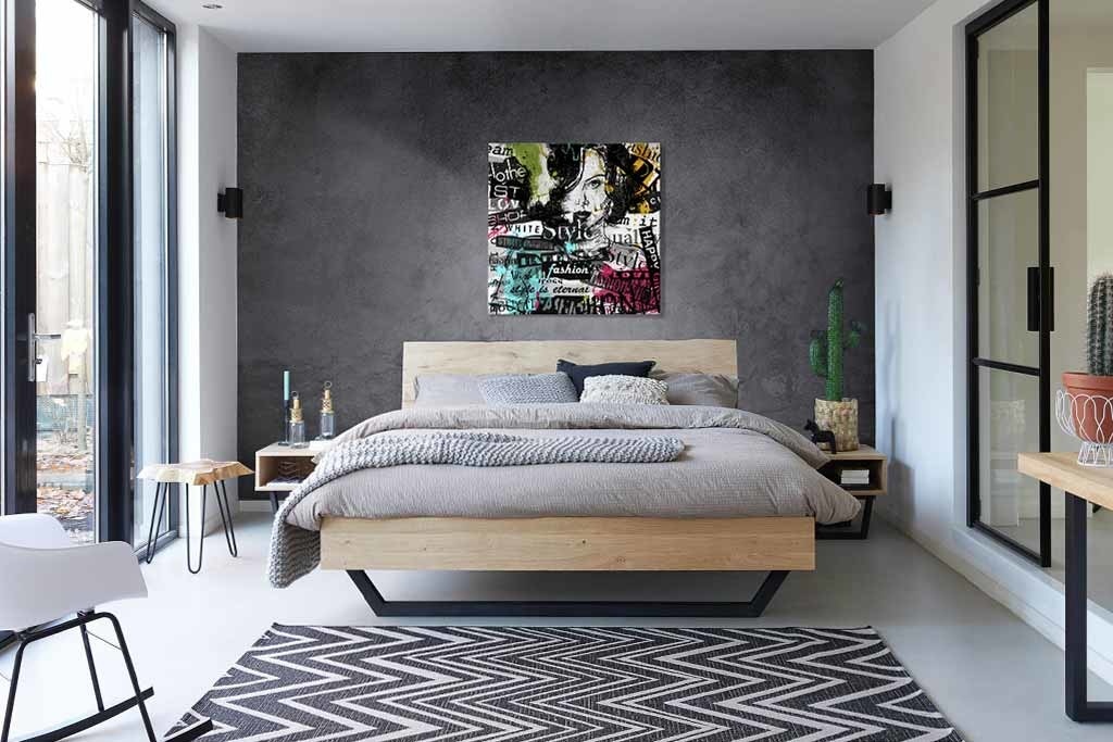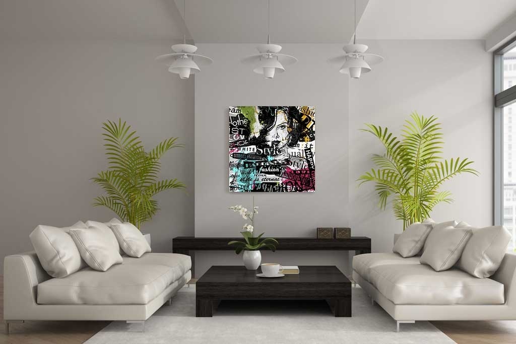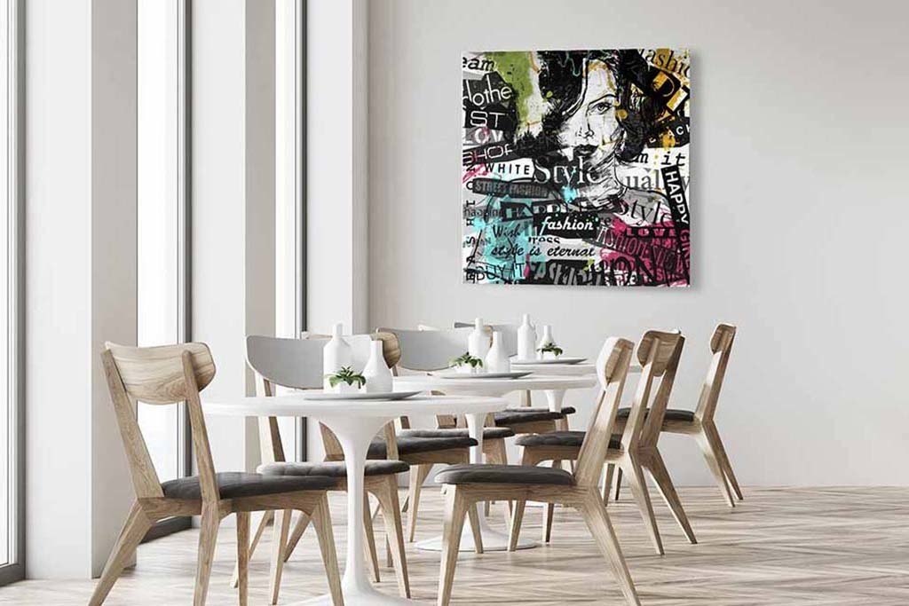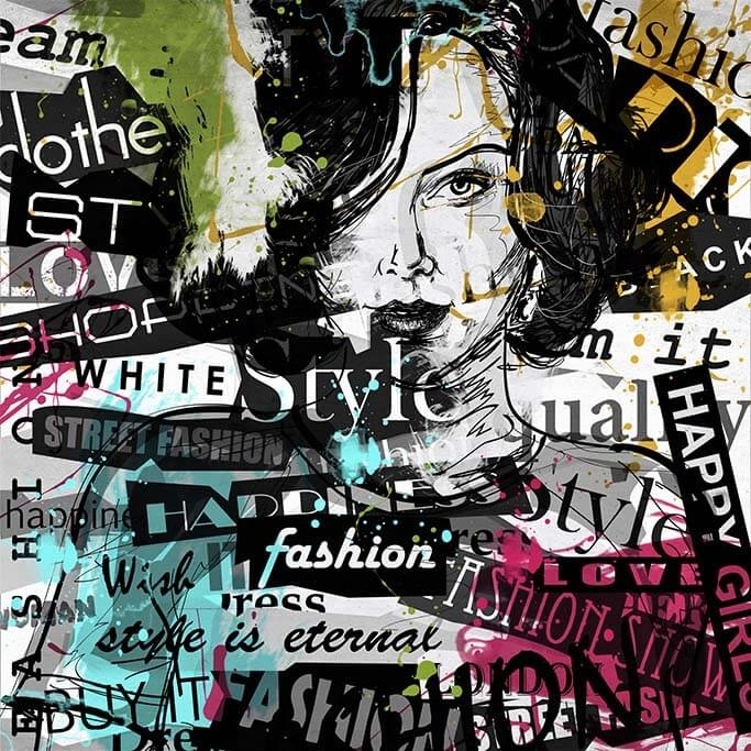In diesem interessanten künstlerischen Bild gibt es eine Menge zu entdecken. Die Grundlage bildet das gezeichnete Porträt einer Frau, umgeben von Textstücken und Farbspritzern. Sehr schön zum Aufhängen in einem Raum, der etwas Farbe gebrauchen kann. Passt in fast jedes Interieur.