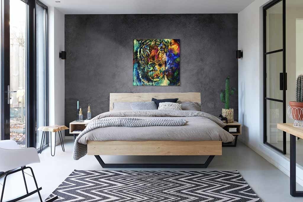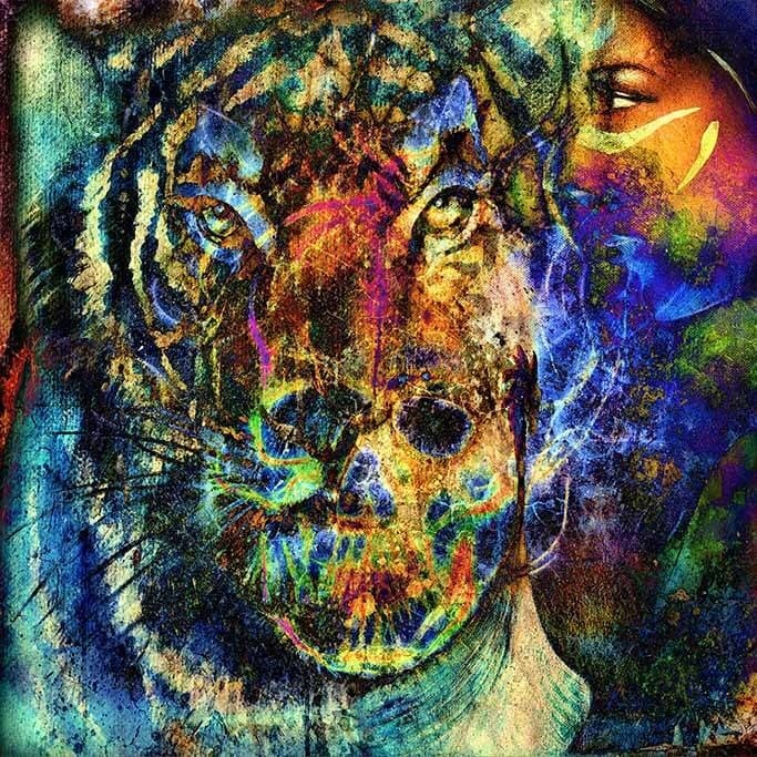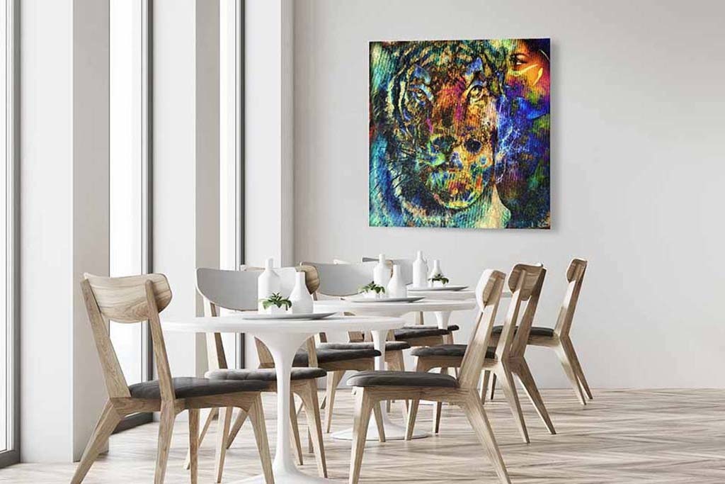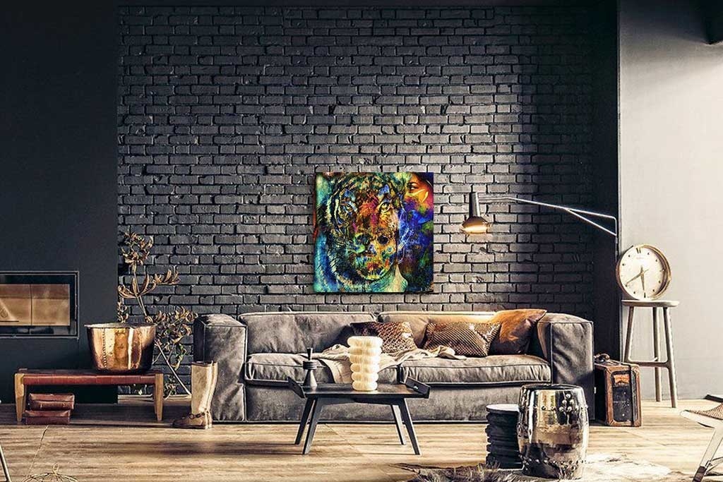 Buntes Bild mit verschiedenen Elementen. Der Tiger und die Frau stechen auf dem Bild am meisten hervor. Sehr geeignet für jedes Interieur, das etwas Farbe gebrauchen kann. Hängen Sie es über die Couch im Wohnzimmer. Passt zu vielen Stilen.