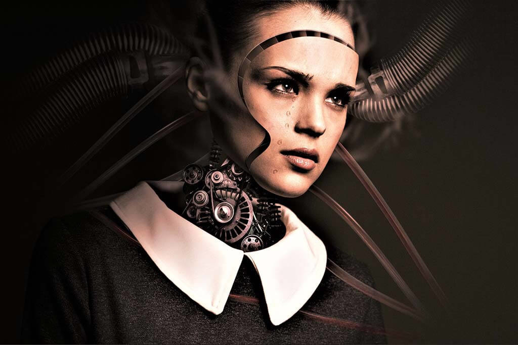 Dies ist ein Bild für alle, die ein besonderes Porträt suchen. Das Bild zeigt eine Art Roboter-Dame-Nonne. Sie weint, während sich ihr Gesicht von ihrem Oberkörper zu lösen scheint. Maschinenteile werden sichtbar. Dieses geheimnisvolle Bild sieht in jedem Raum des Hauses gut aus.
