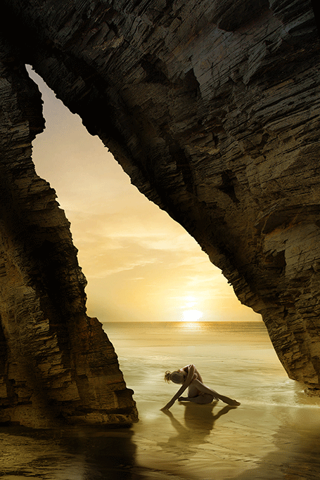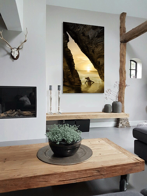Eine interessante Fotokunst des Sonnenuntergangs zwischen den Felsen. Die Frau hat eine geheimnisvolle Körperhaltung, die Sonne scheint auf ihren Rücken. Dadurch entsteht eine ganz besondere Silhouette. Dank des Lichteinfalls und der Perspektive scheint diese Fotokunst an der Wand zum Leben zu erwachen.