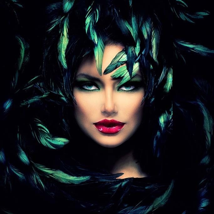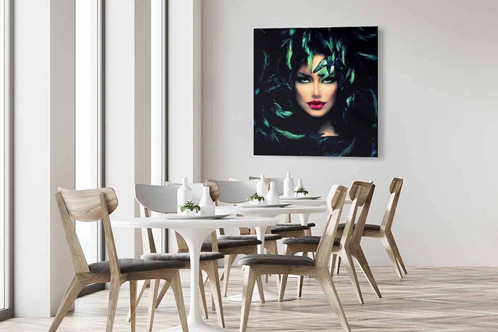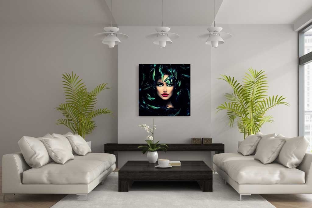 Mysteriös ist diese Frau in der Tat. Die grünen Federn um sie herum scheinen ihr aus dem Kopf zu wachsen. Ihre helle Augenfarbe und das bunte Make-up machen das Bild noch interessanter zu betrachten. Sehr gut geeignet für einen Innenraum, der etwas Farbe gebrauchen könnte.