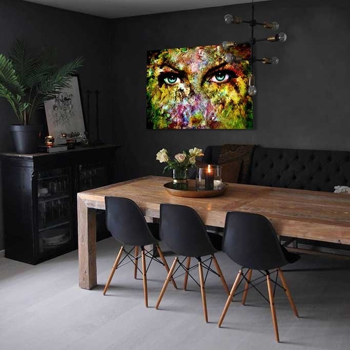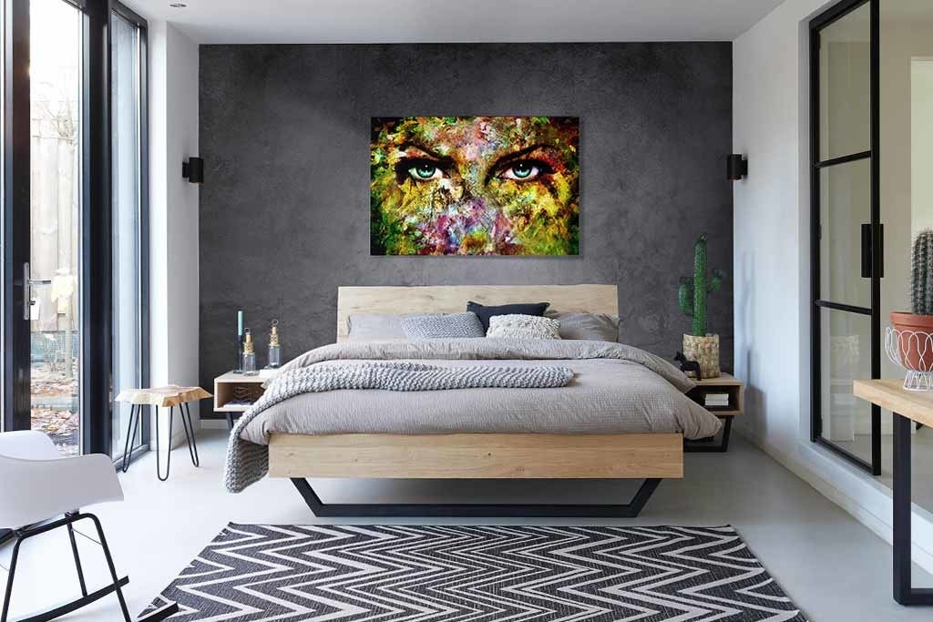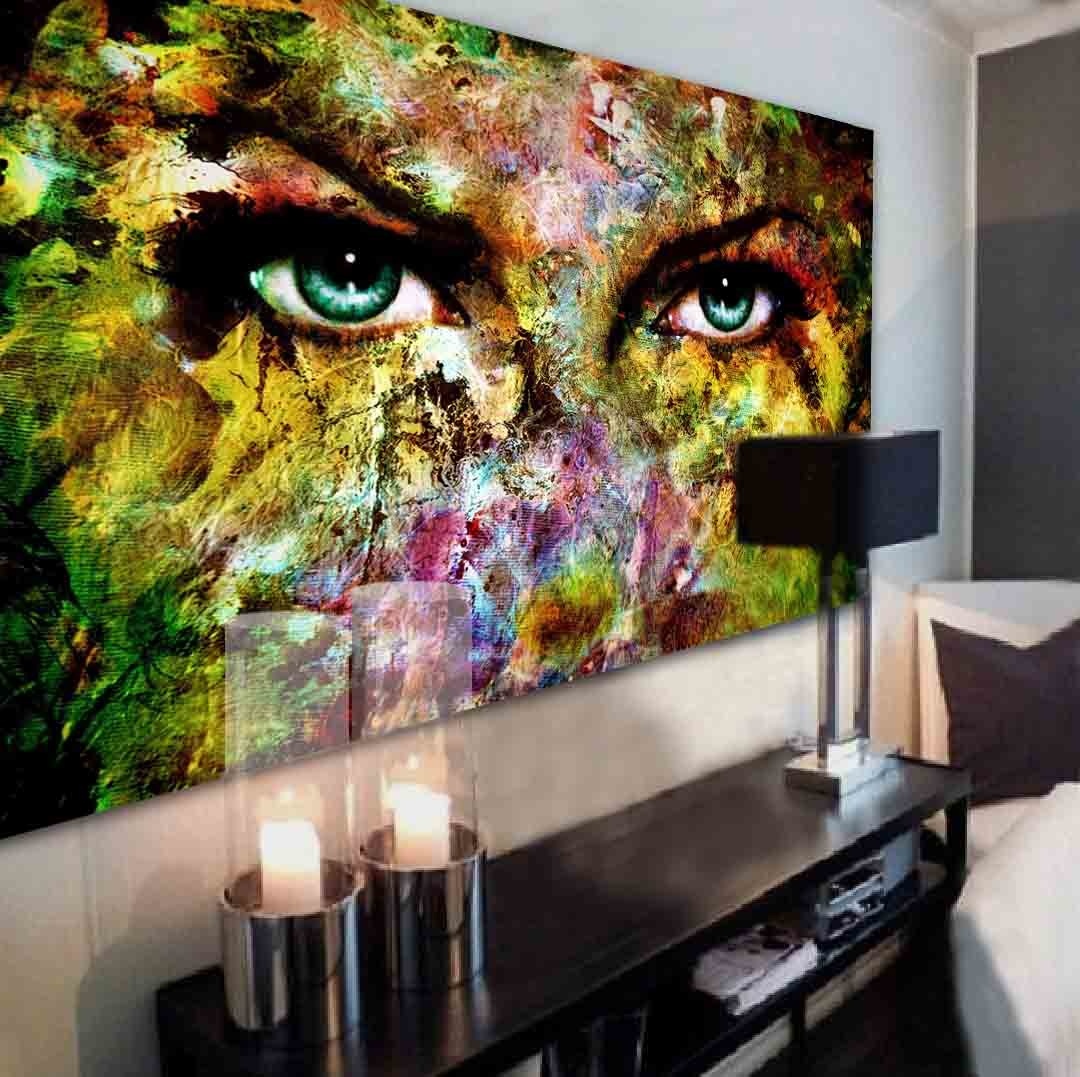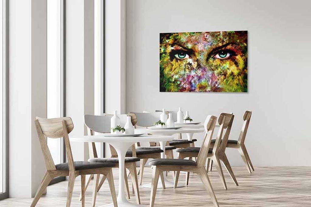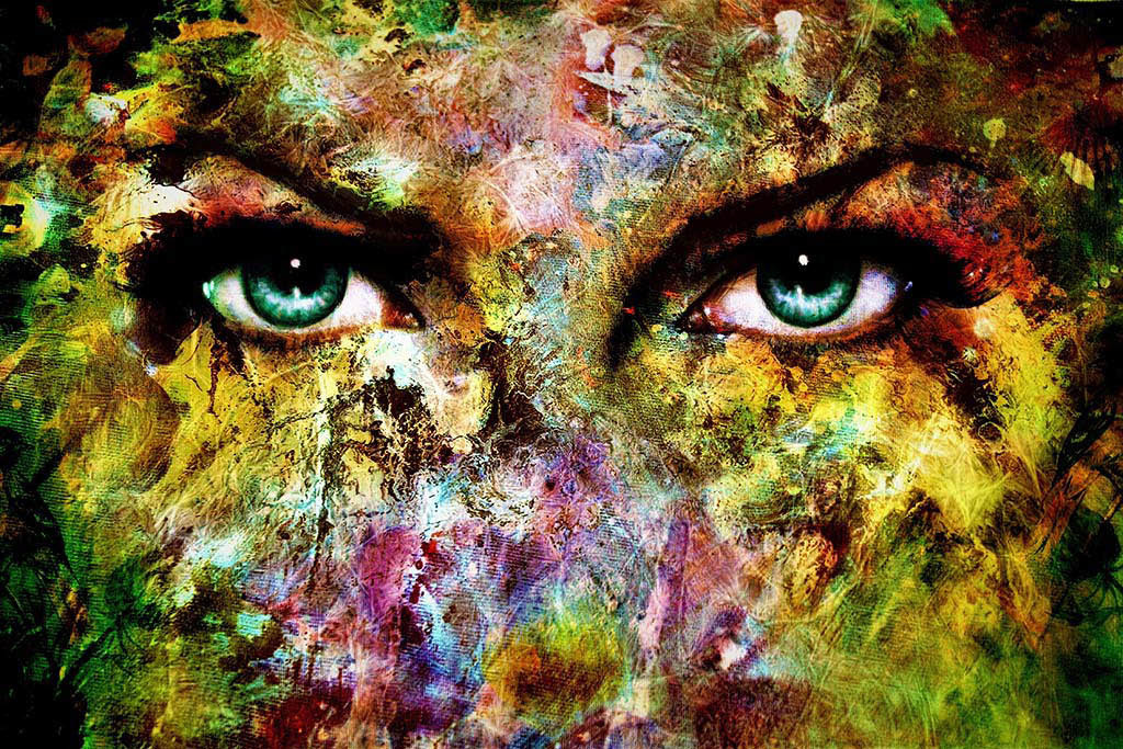 Bunte Kunst, Nahaufnahme eines gemalten Frauengesichts mit markanten Augen.