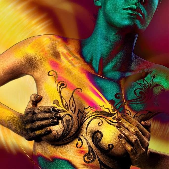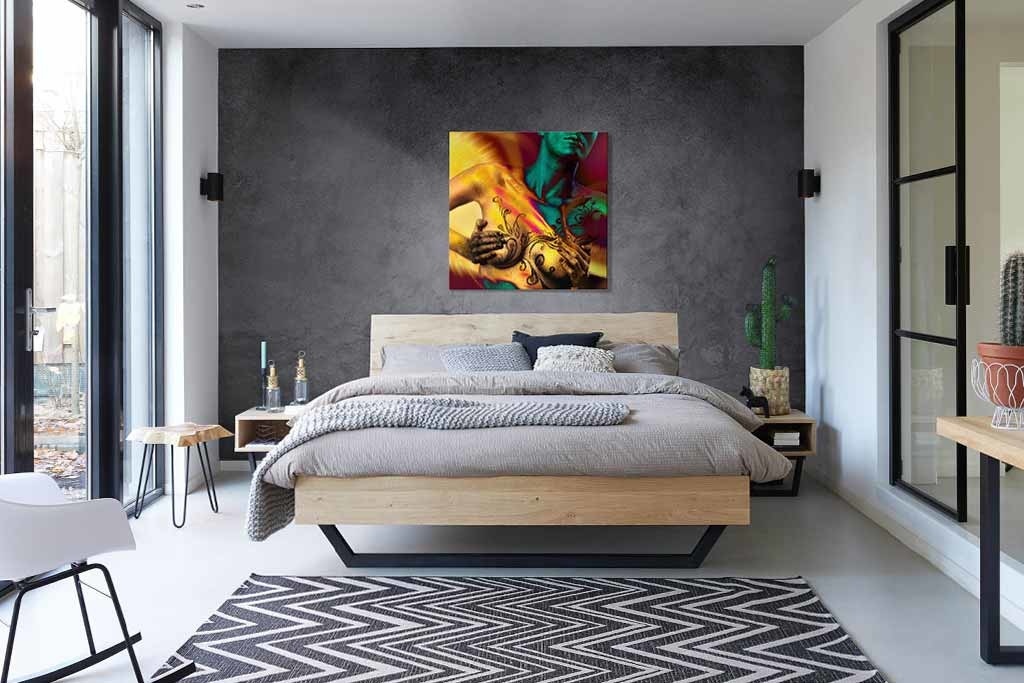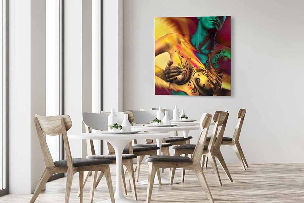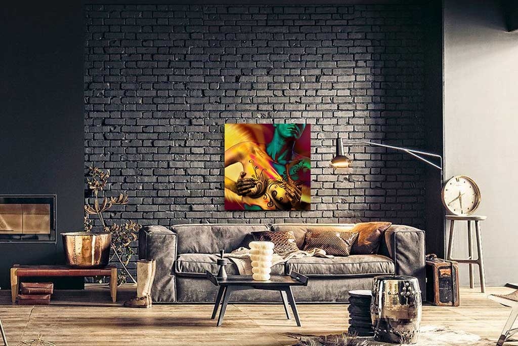 Bild einer Frau mit Farben und Bildern auf dem Körper. Das Bild ist sehr farbenfroh und erhellt den Raum direkt. Sieht zum Beispiel gut aus in einem Wohn- oder Schlafzimmer, das mehr Farbe braucht. Auch schön zu kombinieren mit ähnlichen Bildern von Körpern.