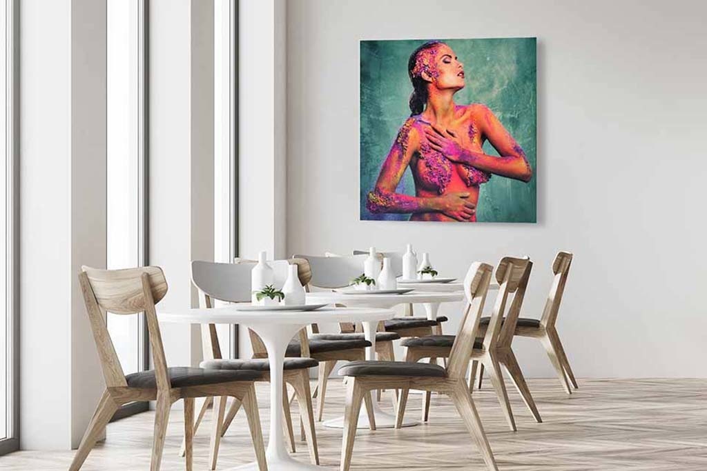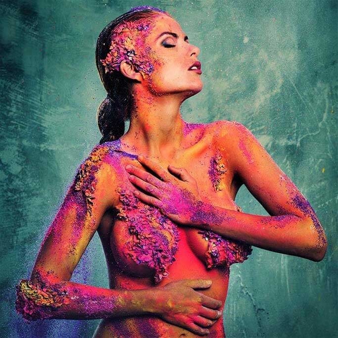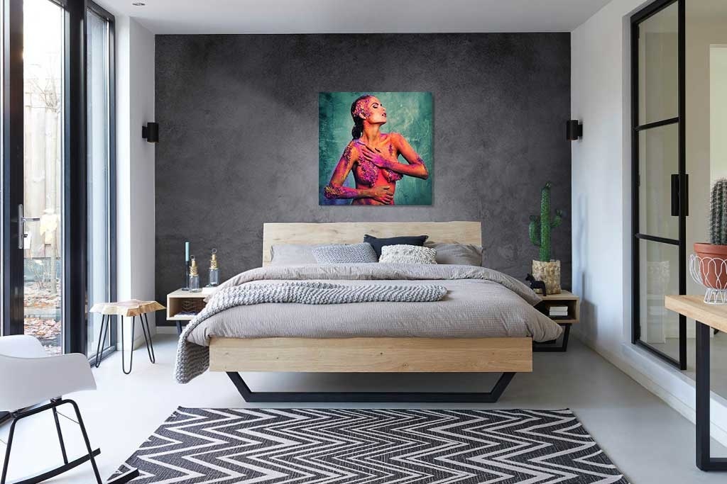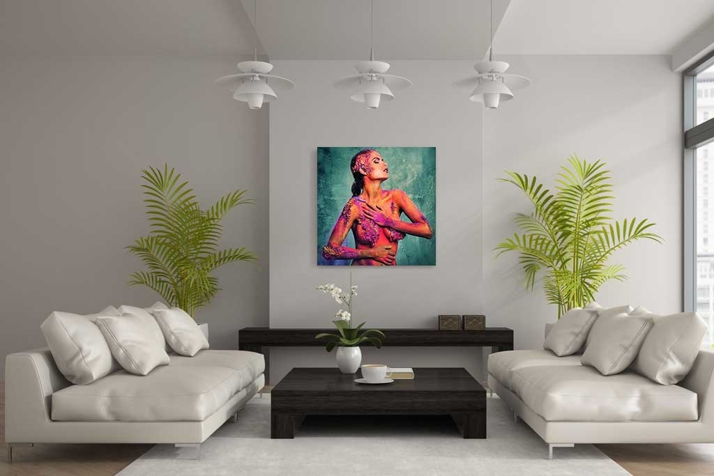 Spezielles Bild einer Frau mit allen möglichen Farben auf einem ansonsten unbedeckten Körper. Durch die Körperhaltung der Frau bekommt das Bild etwas sinnliches. Die bunte Farbe passt perfekt zur Hintergrundfarbe. Schön zu kombinieren mit anderen Bildern aus dieser Serie. Passt in jeden Innenraum.