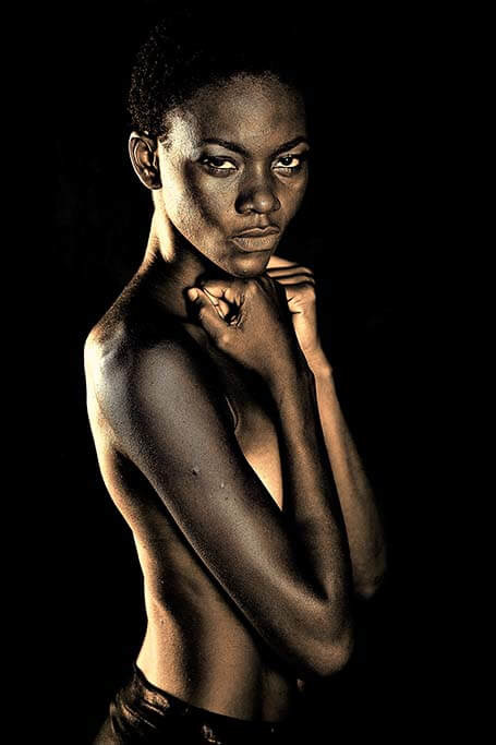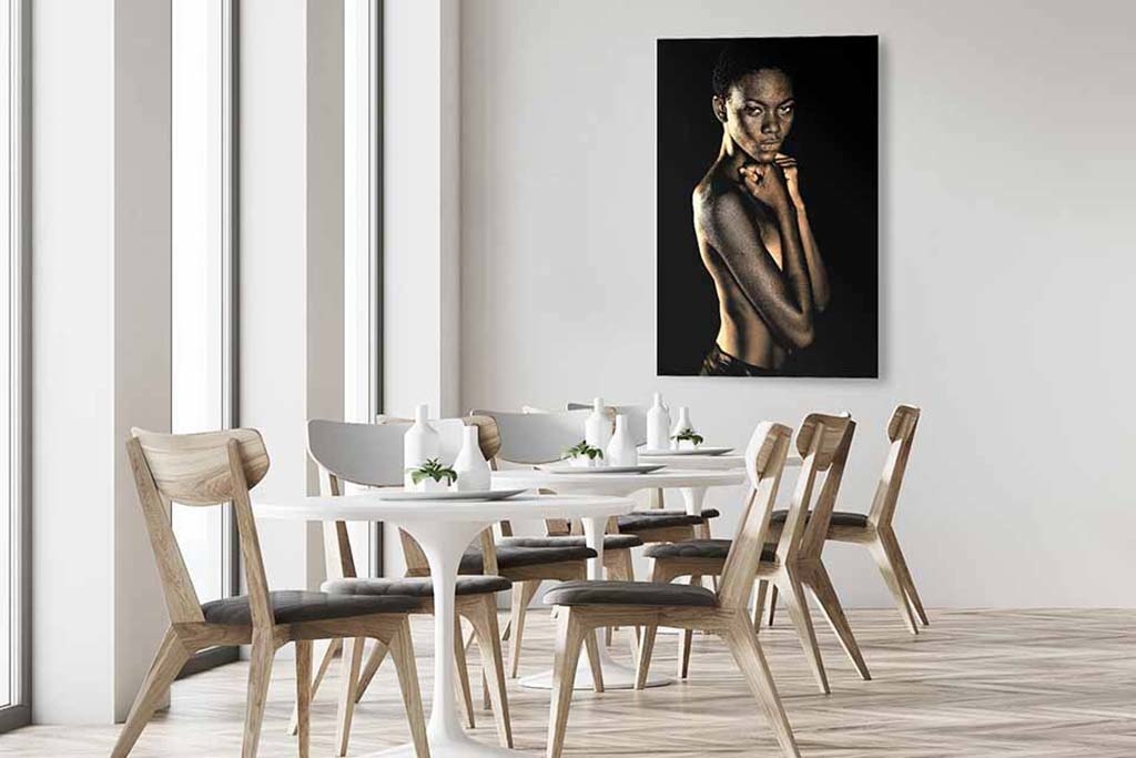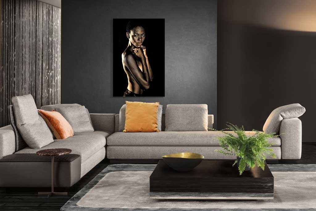 Stilvolles Porträtfoto einer Frau mit nacktem Oberkörper. Das Bild wurde gekonnt belichtet und hebt die Schönheit der abgebildeten Person hervor. Der schwarze Hintergrund macht das Bild noch eindrucksvoller. Passt zu jeder Einrichtung und sieht in vielen Räumen des Hauses gut aus.