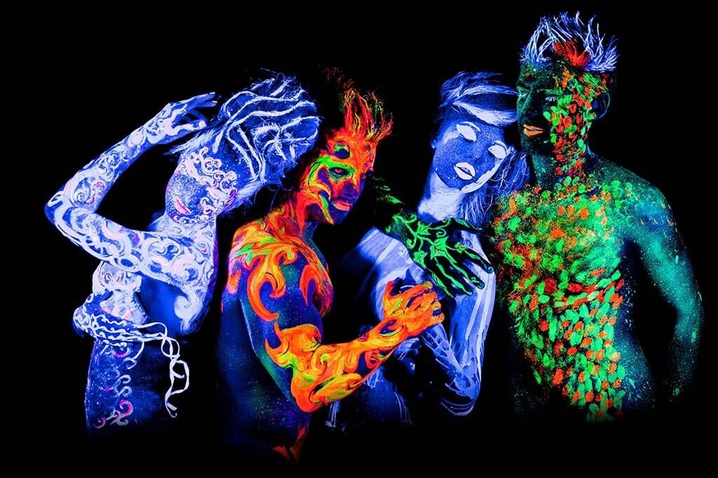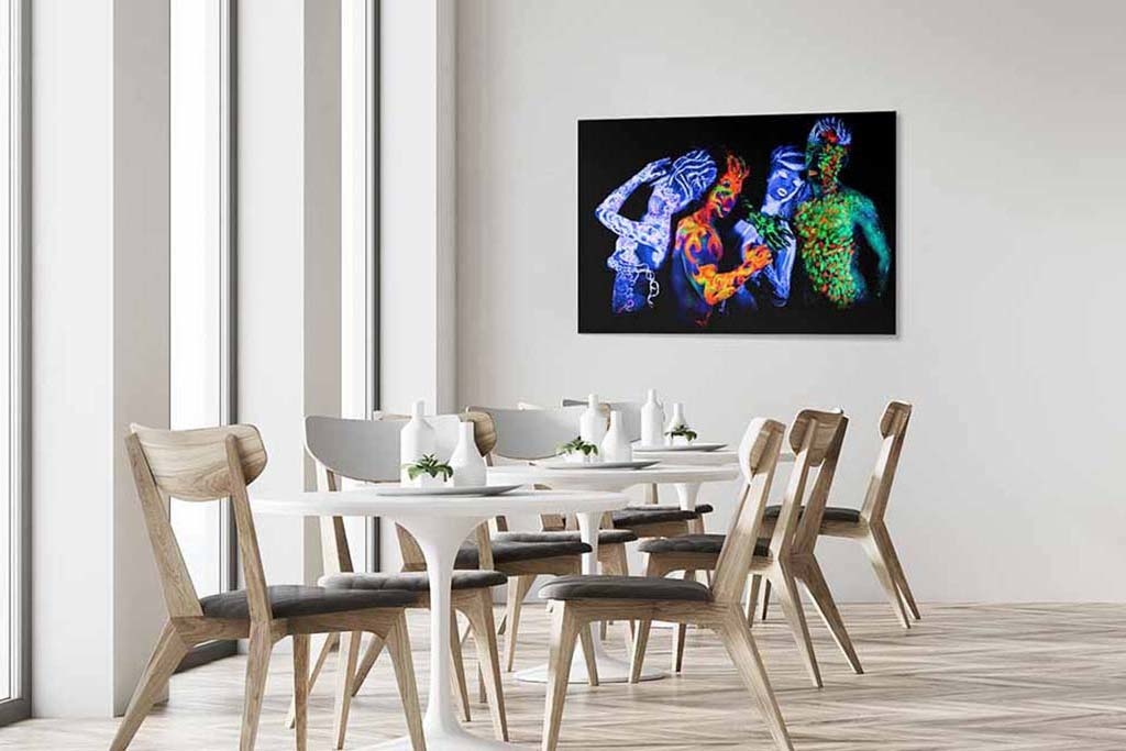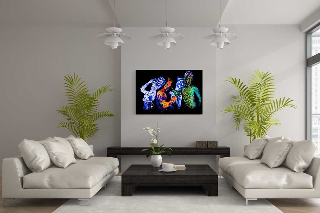 Vier Personen mit Neonfarben auf dem Körper. Die Personen sind komplett mit leuchtenden Neonfiguren bemalt. Der dunkle Raum verstärkt die Wirkung des Fotos. Für alle, die besondere Fotografie und Farbe lieben. Passt zu fast jedem Wohnstil und macht in vielen Räumen eine gute Figur.