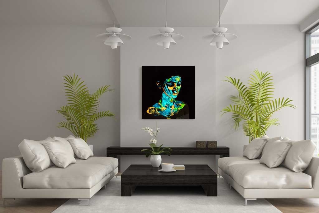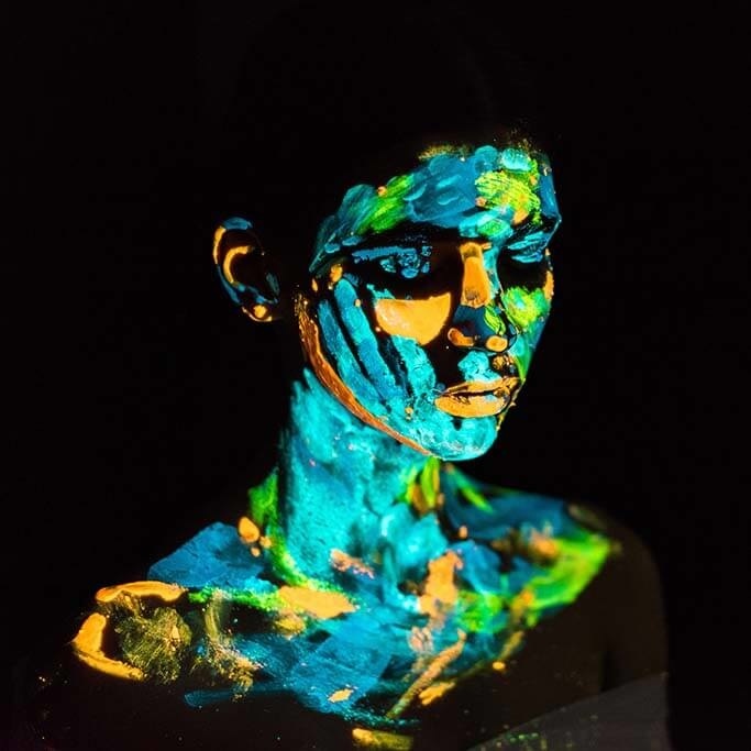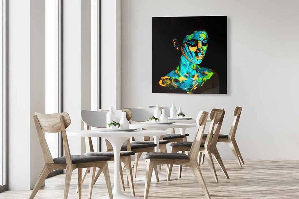 Buntes Bild einer Frau mit leuchtender Farbe im Gesicht und am Oberkörper. Die orangen, blauen und grünen Neonfarben verleihen dem Foto einen besonderen Effekt. Schön für einen Innenraum, der etwas Farbe vertragen kann. Sieht gut aus im Wohnzimmer, Schlafzimmer und Büro.
