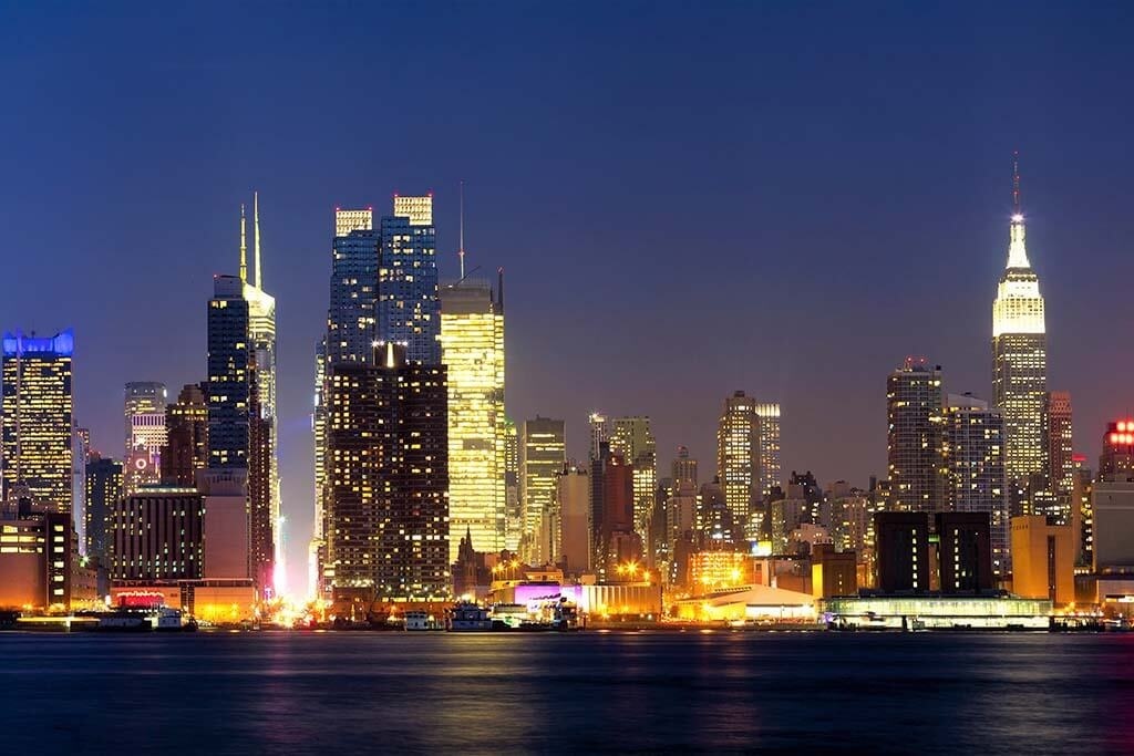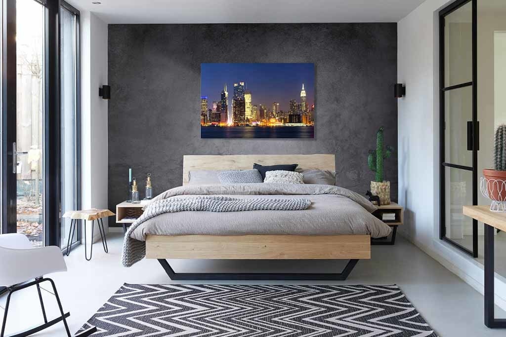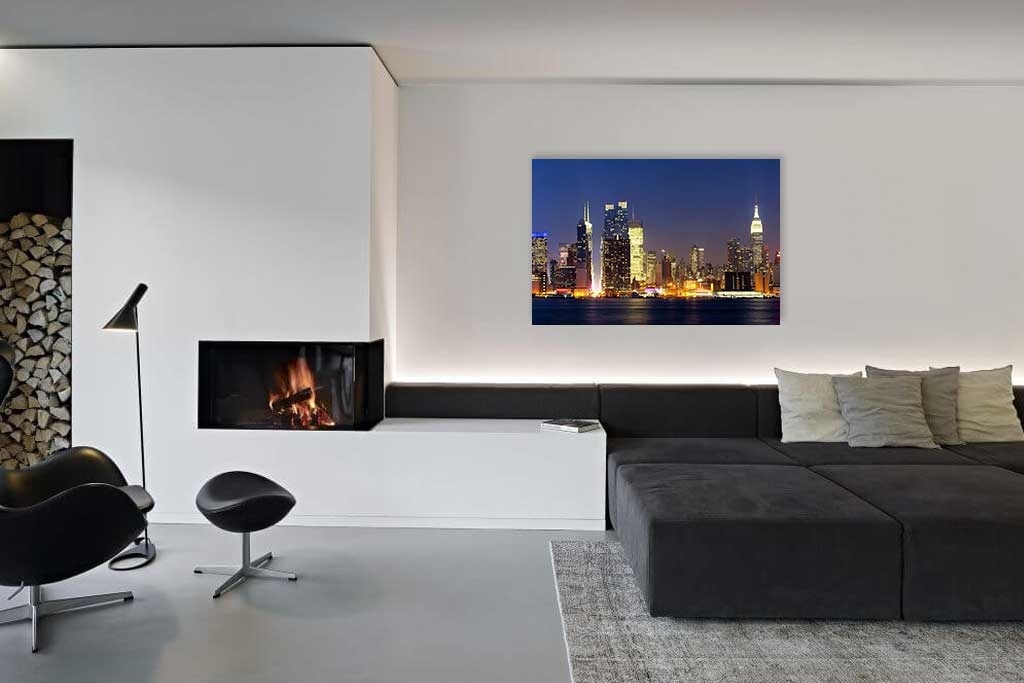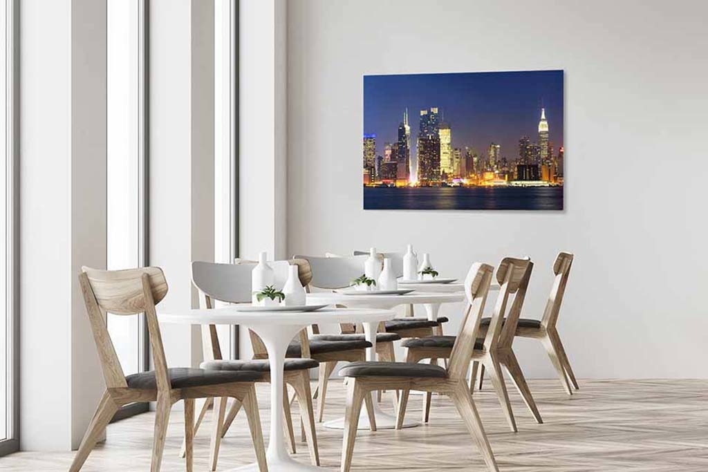Keine Stadt ist so fotogen wie New York. Besonders die Skyline ist ein lohnendes Motiv für die Fotografie. Auf diesem bunten Bild von New York im Abendlicht ist genug zu sehen. Schön zum Aufhängen über der Couch im Wohnzimmer oder im Schlafzimmer über dem Bett.