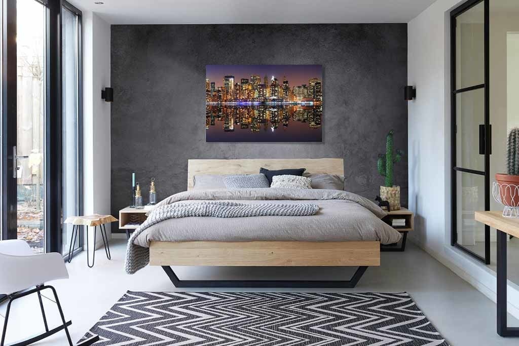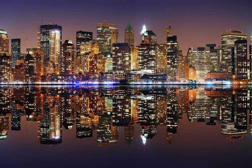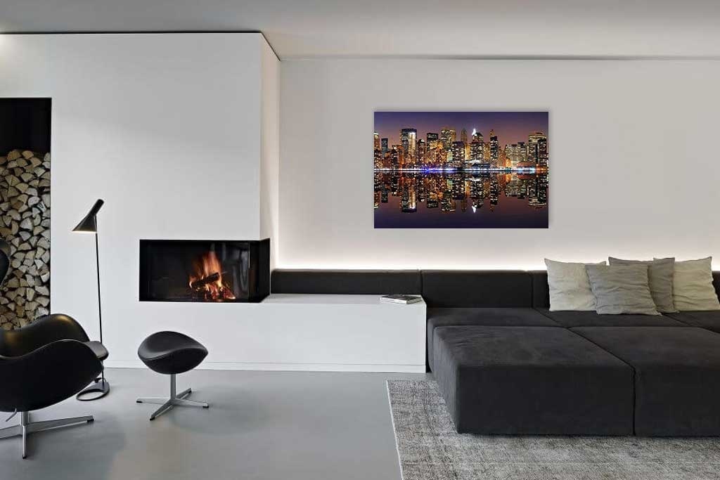 Ein besonders Bild von New York im Abendlicht. Die vielen Lichter der hohen Gebäude in der Stadt machen es zu einem tollen Anblick. Die Reflektion im Wasser macht das Bild besonders attraktiv. Sieht in jedem Raum des Hauses gut aus.