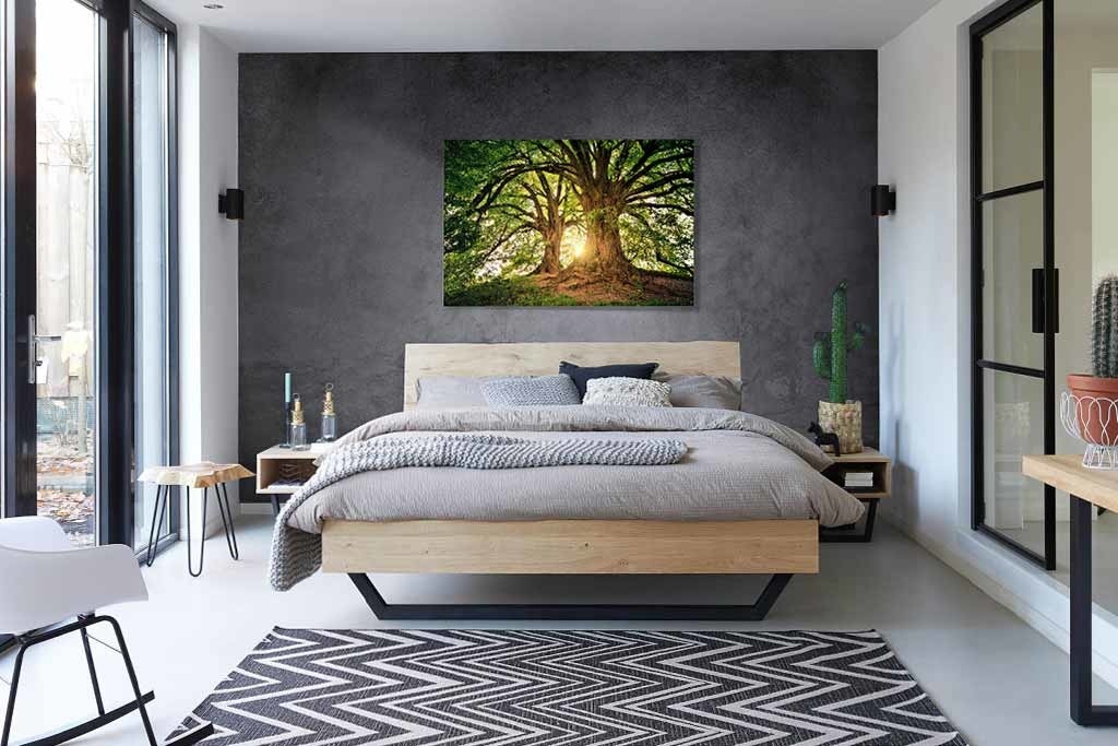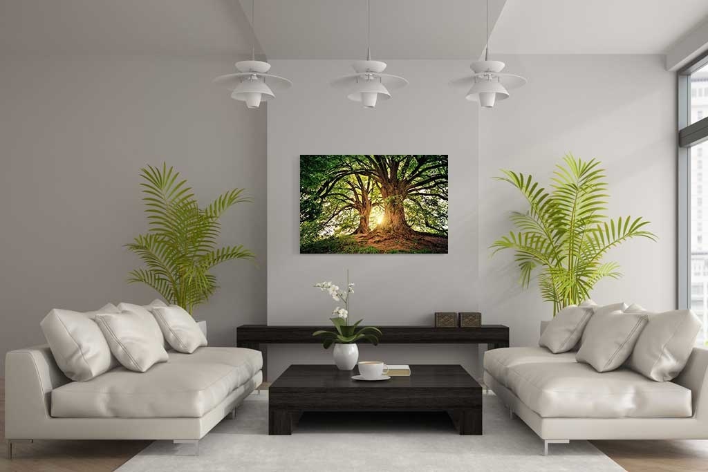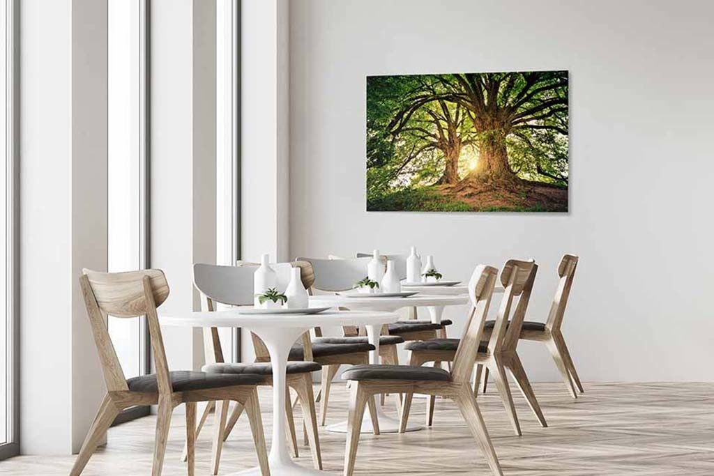 Bild von zwei großen alten Bäumen. Die langen Äste, das Grün und das Licht geben dem Ganzen einen märchenhaften Charakter. Kombinieren Sie mit anderen Bildern von Bäumen oder Wäldern und kreier Ihre eigene Serie. Sieht gut aus im Wohnzimmer, Schlafzimmer oder Büro.