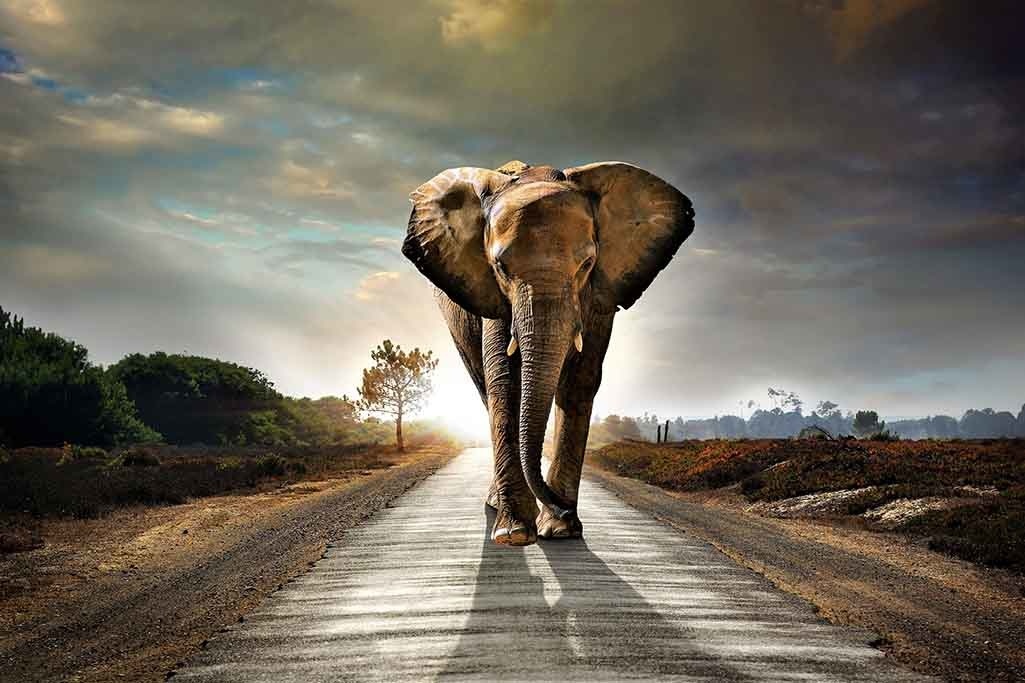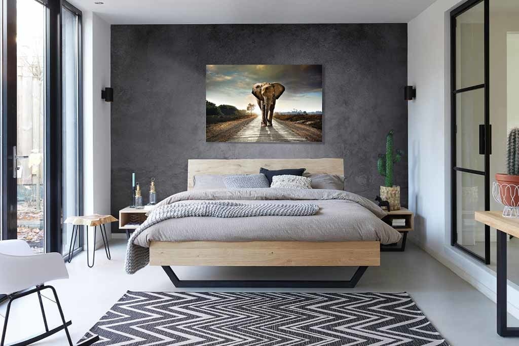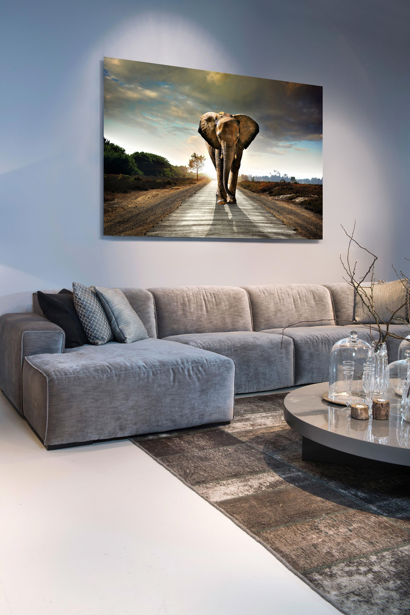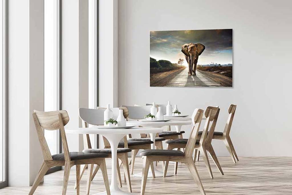 Spezielle Farbfotografie eines Elefanten, der auf einer Straße läuft. Geeignet für alle, die ein wenig mehr Natur und Tier ins Interieur bringen wollen. Das stilvolle Bild passt zu jedem Wohnstil und macht an jeder Wand eine gute Figur. Kann mit anderen Bildern von speziellen Tieren kombiniert werden.