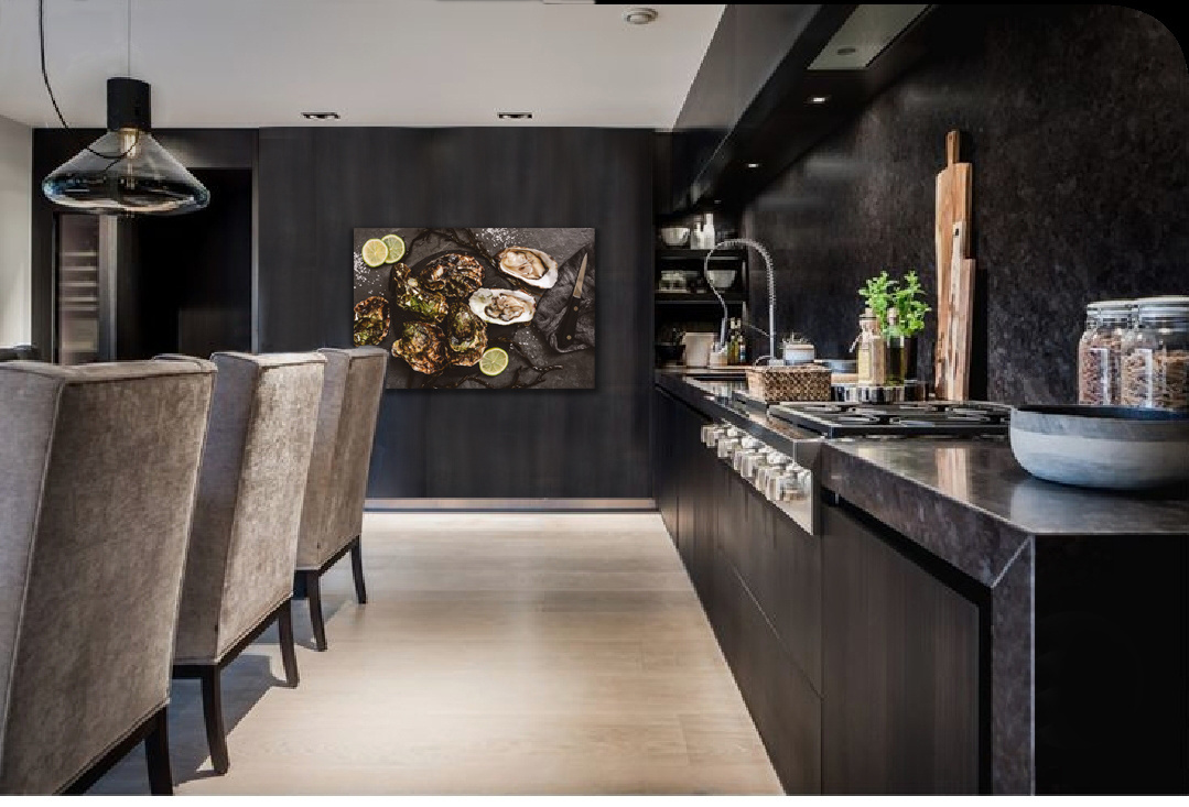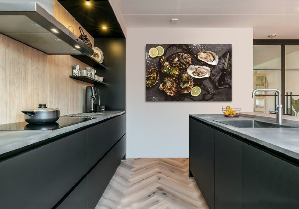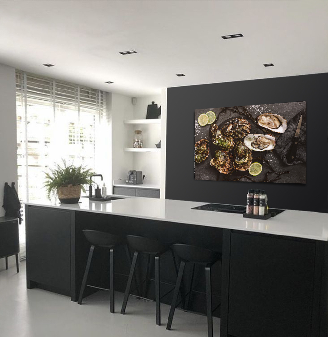 Interessante Farben und Formen kommen in der "Oyster Pub"-Fotokunst zusammen. Die dunkle Farbpalette sorgt für einen luxuriösen, hochwertigen Look und das Meersalz und die Limette vollenden die Kunst. Das Muster der Austern ist leicht zu erkennen und kann fast als abstrakt bezeichnet werden. Schön in der Küche gegen ein Licht und sogar eine dunkle Wand. Auch in Restaurants ist diese Fotokunst ein echter Blickfang.