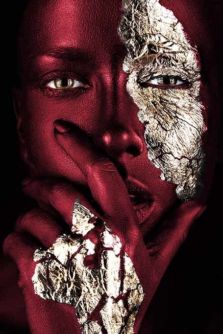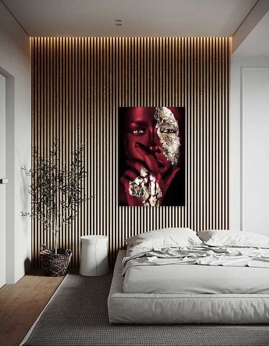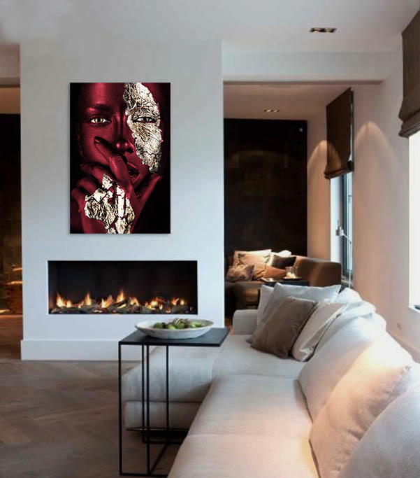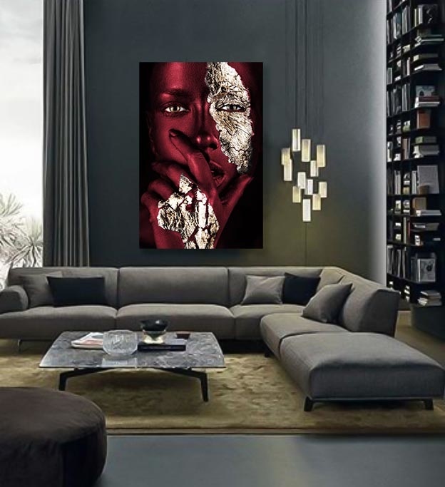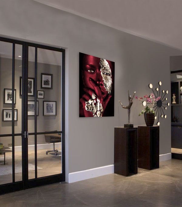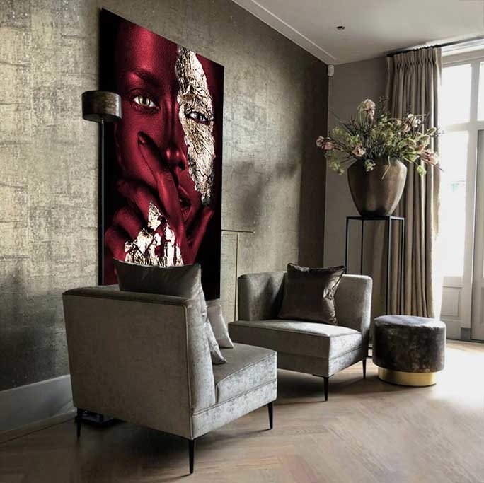 Bereichern Sie Ihr Interieur mit dieser schönen Nahaufnahme-Fotokunst. Das Gesicht der Frau ist mit attraktiver weinroter Farbe bemalt. Ihr Blick strahlt Kraft und Geheimnis aus und die goldenen Details auf ihrem Gesicht und ihrer Hand springen aus dem Kunstwerk heraus. Außerdem sind alle Details des Gesichts deutlich sichtbar, so dass man immer wieder hinschauen möchte. So ist Ihnen ein echter Blickfang an der Wand sicher. Hängen Sie diese Fotokunst zum Beispiel als Blickfang im Wohnzimmer oder als luxuriöse Ergänzung in Ihrem Schlafzimmer auf. Painted Bordeaux' ist eine Variante des beliebten 'Noir Goldest'.