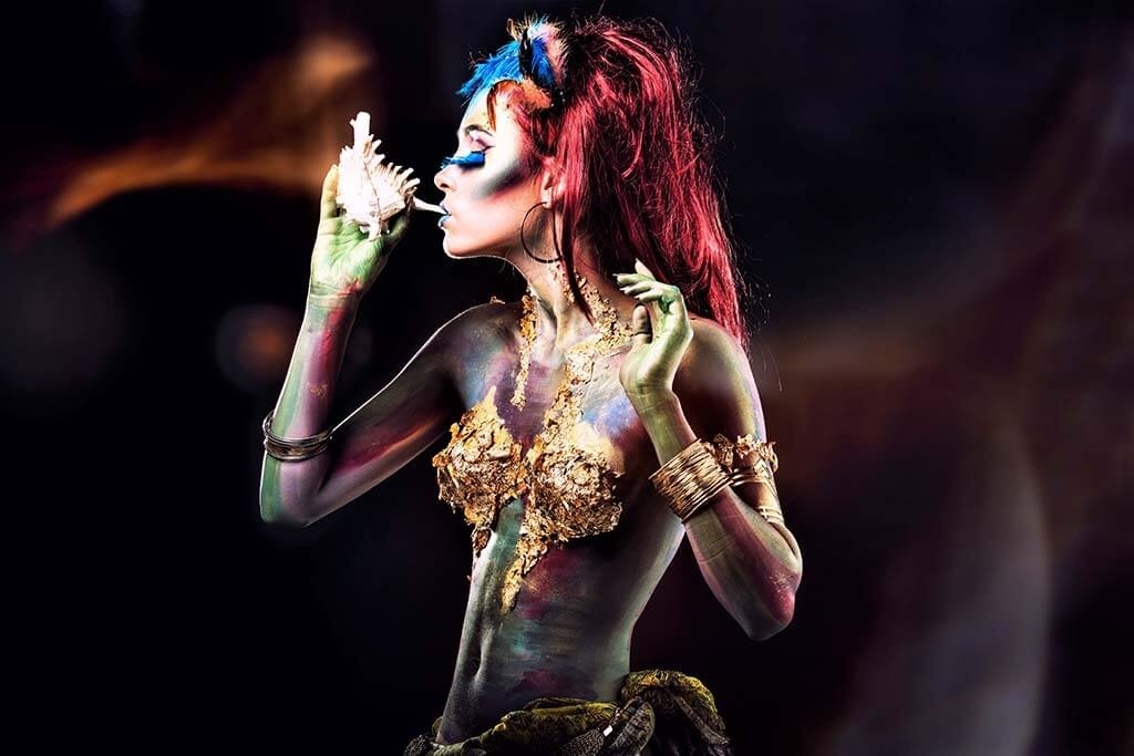 Interessante und bunte Bild einer Art Meerjungfrau. Aufgrund ihrer langen roten Haare und des goldenen Oberteils scheint die Frau aus dem Meer geschwommen zu sein. Dieser Gedanke wird durch die Muschel in ihrer Hand betont. Ein Bild, das sich von der Wand abhebt.