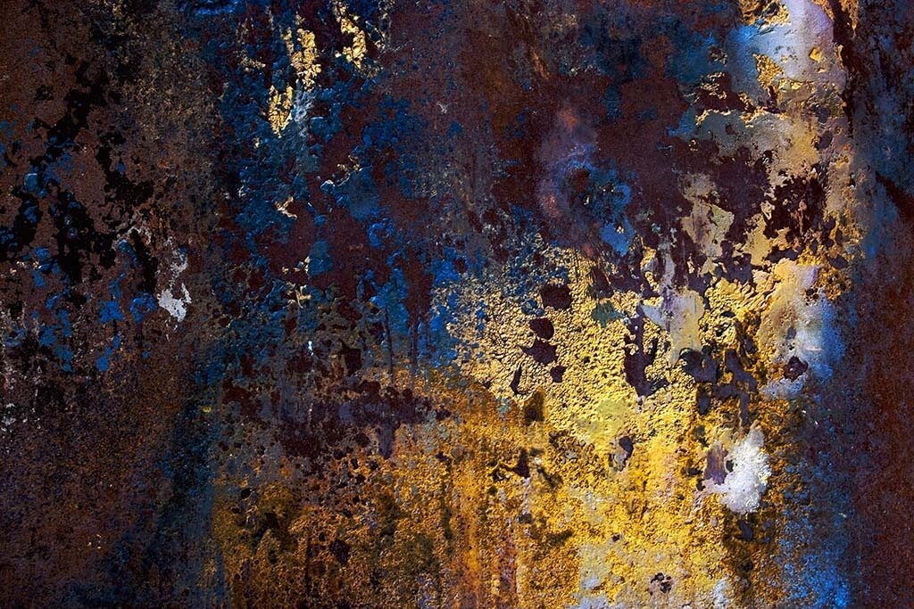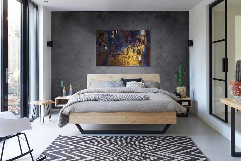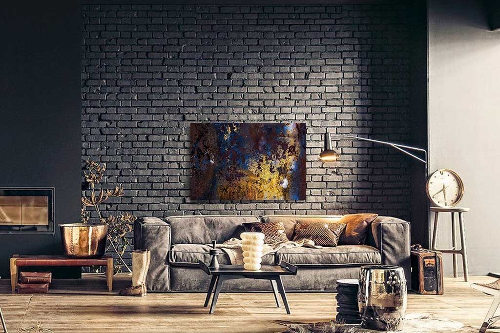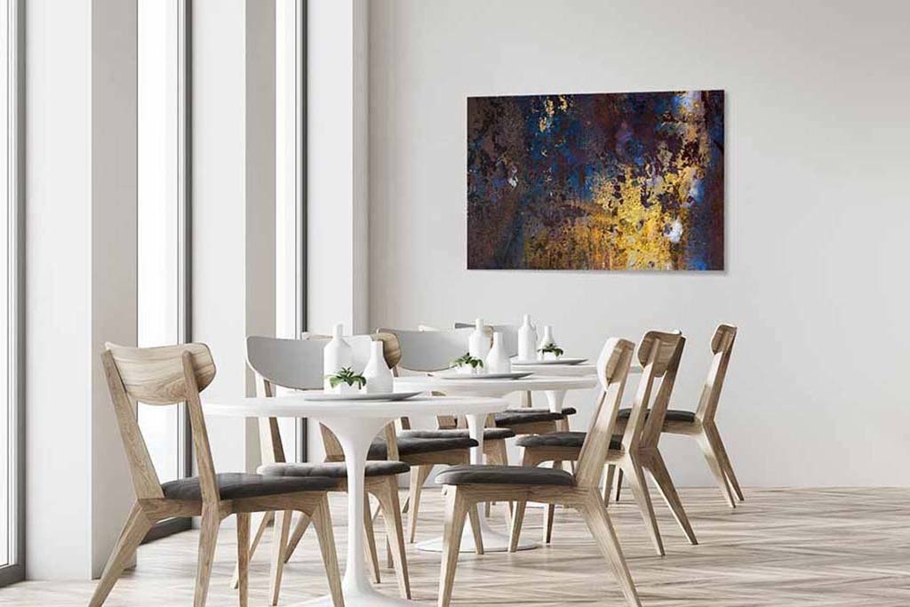 Interessantes Bild eines Kunstwerkes mit Gold-, Bronze- und blauen Elementen. Geeignet für alle, die ein wenig mehr Kunst und Farbe in den Innenraum bringen wollen. Kombinieren Sie mit anderen Bildern aus dieser Serie und hängen Sie sie nebeneinander auf. Passt zu vielen Wohnstilen und sieht in allen Räumen gut aus.