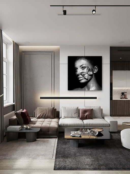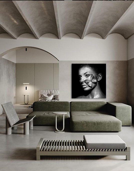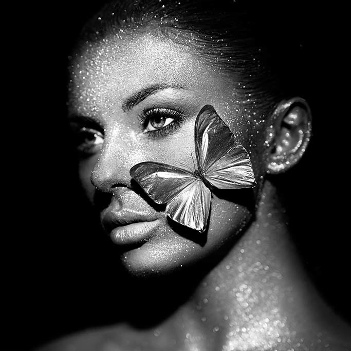 Schöne Frau künstlerisch dargestellt mit Schmetterling im Gesicht. Die Kontraste zwischen hell und dunkel sind wunderschön, die Kunst ist ein echter Blickfang, sowohl in quadratischer als auch in rechteckiger Form erhältlich.