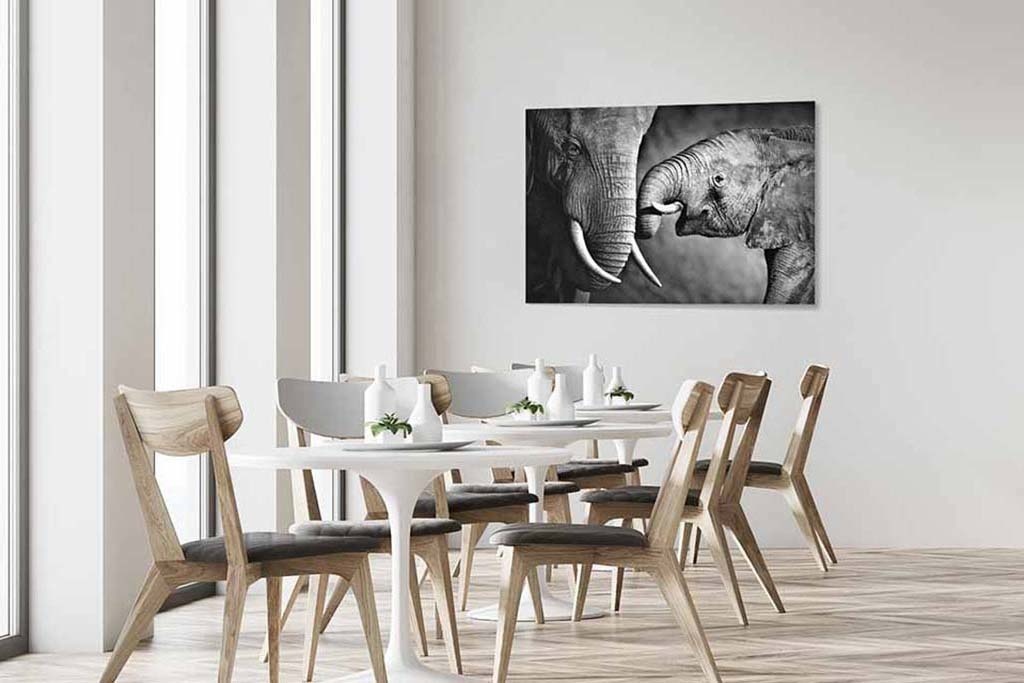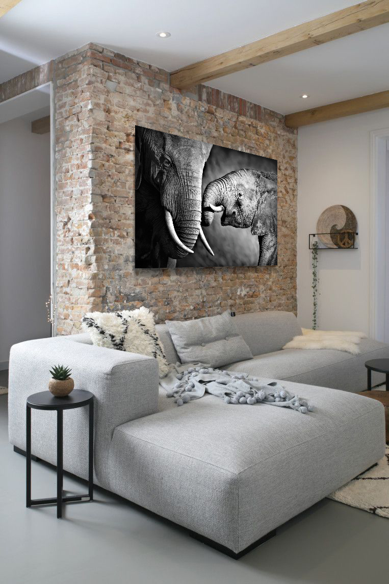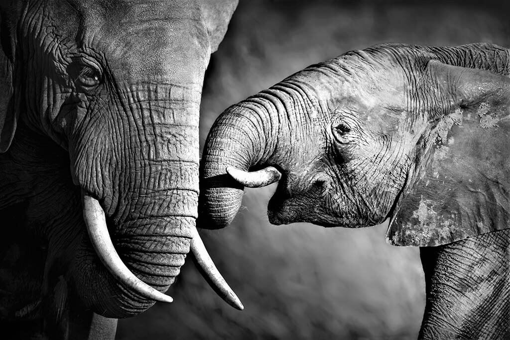 Spezielles Schwarz-Weiß-Bild eines Elefantenkalbs und seiner Mutter. Der Kleine versucht, die Aufmerksamkeit seiner Mutter zu erregen. Dies ergibt ein schönes Bild. Zum Kombinieren mit anderen Schwarz-Weiß-Bildern von Tieren in freier Wildbahn. Passt zu vielen verschiedenen Inneneinrichtungen.